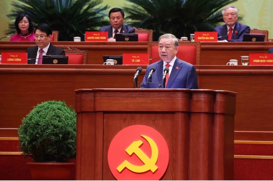 Tổng Bí thư Tô Lâm trình bày Báo cáo của Ban Chấp hành Trung ương Đảng khóa XIII về các văn kiện trình Đại hội XIV của Đảng. (Ảnh: TTXVN).