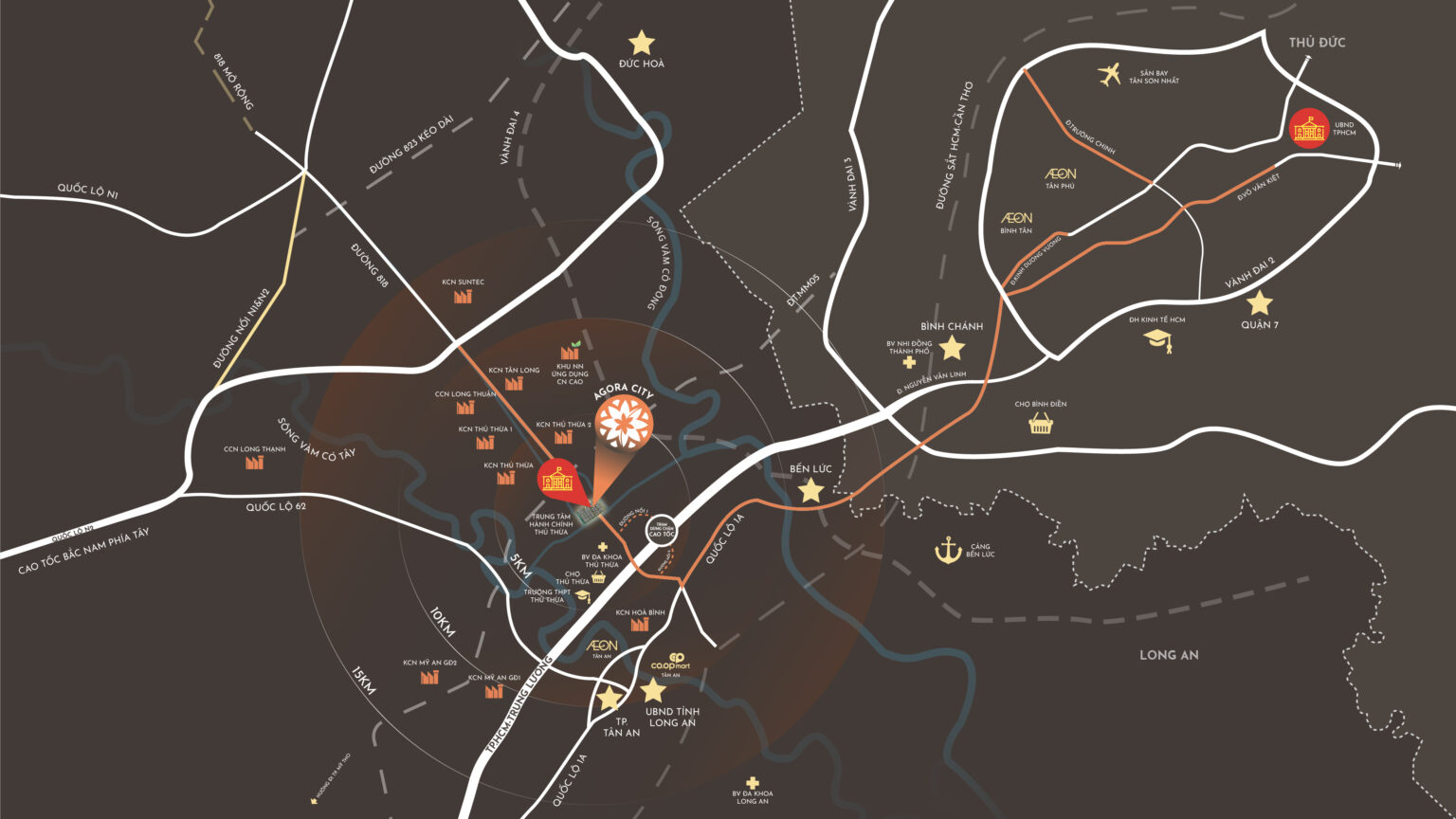 Agora City nằm mặt tiền đường DT818 – tuyến giao thông quan trọng của Thủ Thừa, kết nối trực tiếp với cao tốc TP.HCM – Trung Lương. Từ dự án, cư dân có thể di chuyển về TP.HCM trong khoảng 20-30 phút (tùy điều kiện giao thông), thuận tiện cho công việc, giao thương và tiếp cận các dịch vụ đô thị lớn.