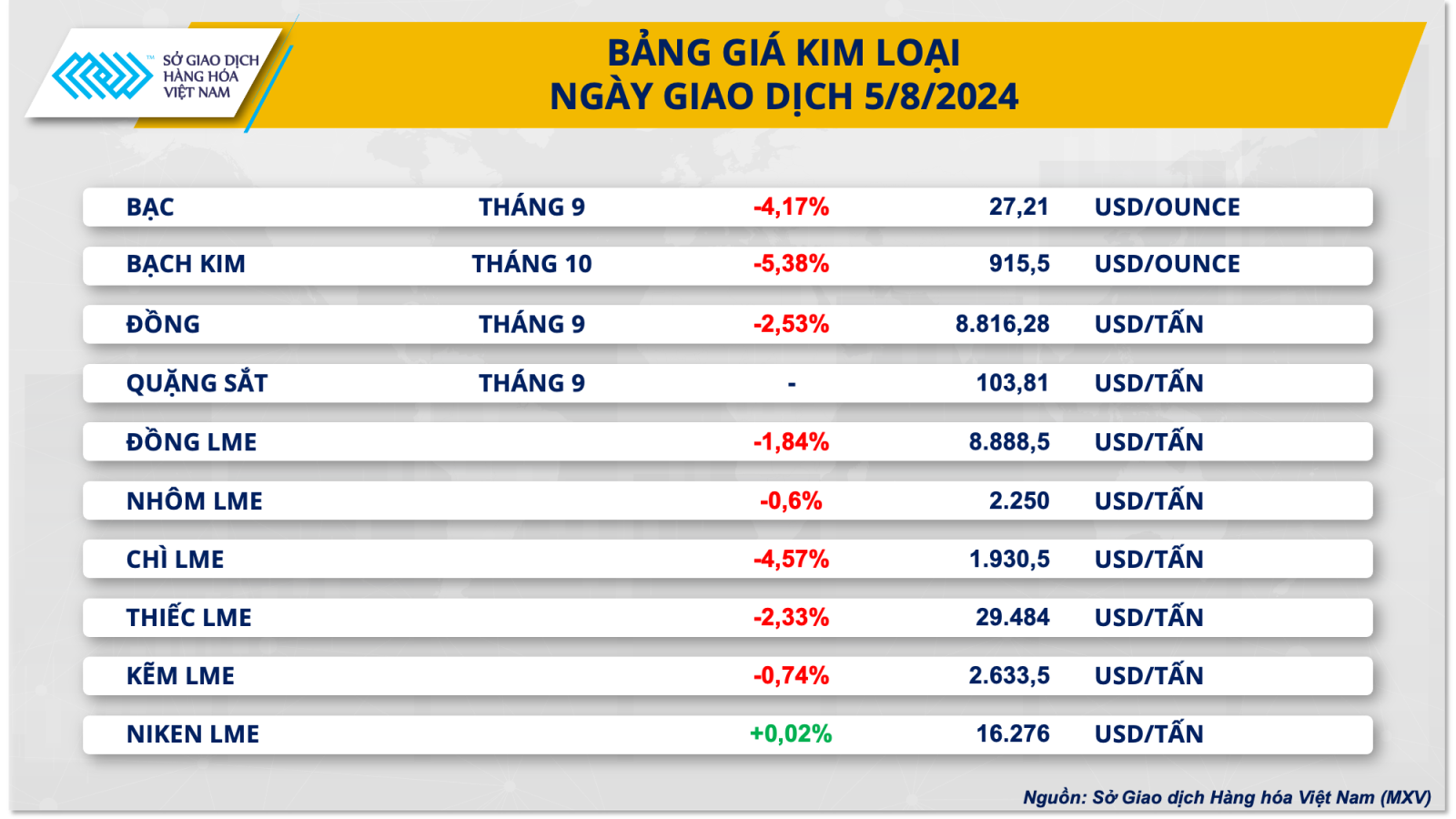 Sở Giao dịch Hàng hóa Việt Nam (MXV) cho biết thị trường tài chính thế giới, trong đó có giao dịch hàng hóa đỏ lửa trong ngày hôm qua (5/8). Giá nhiều mặt hàng quan trọng đóng cửa tiếp đà lao dốc kéo chỉ số MXV-Index rơi thêm 0,74% xuống 2.077 điểm.