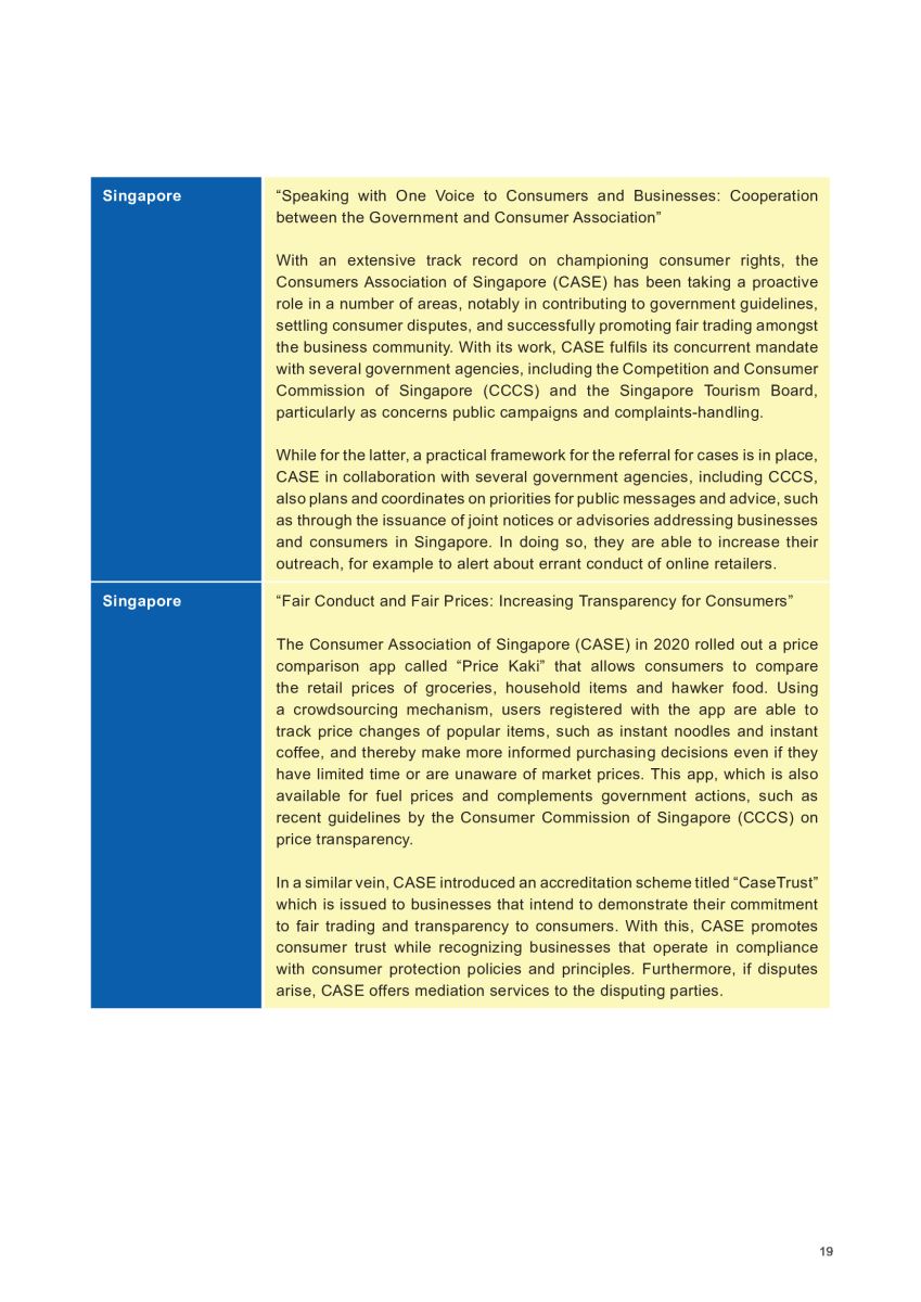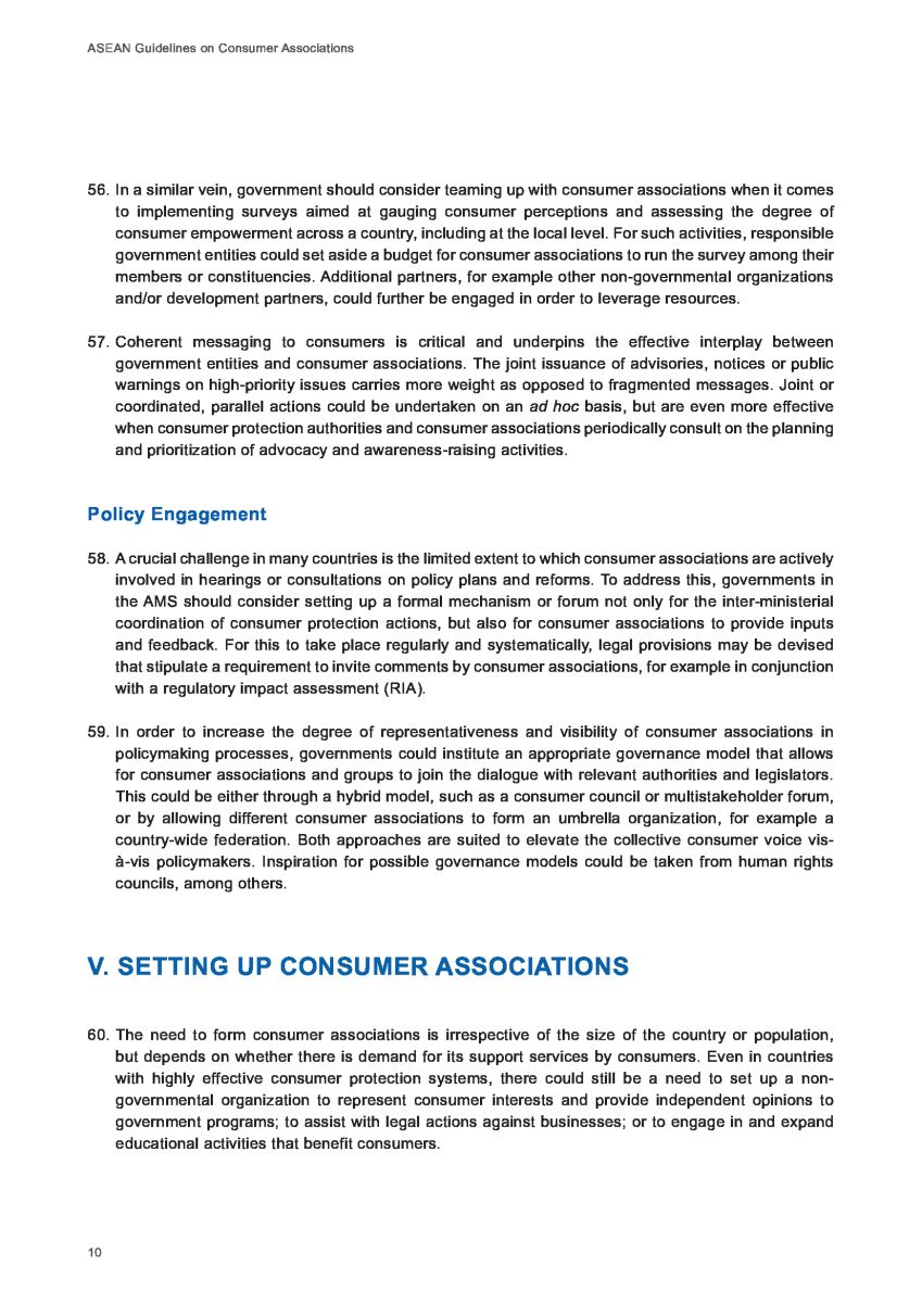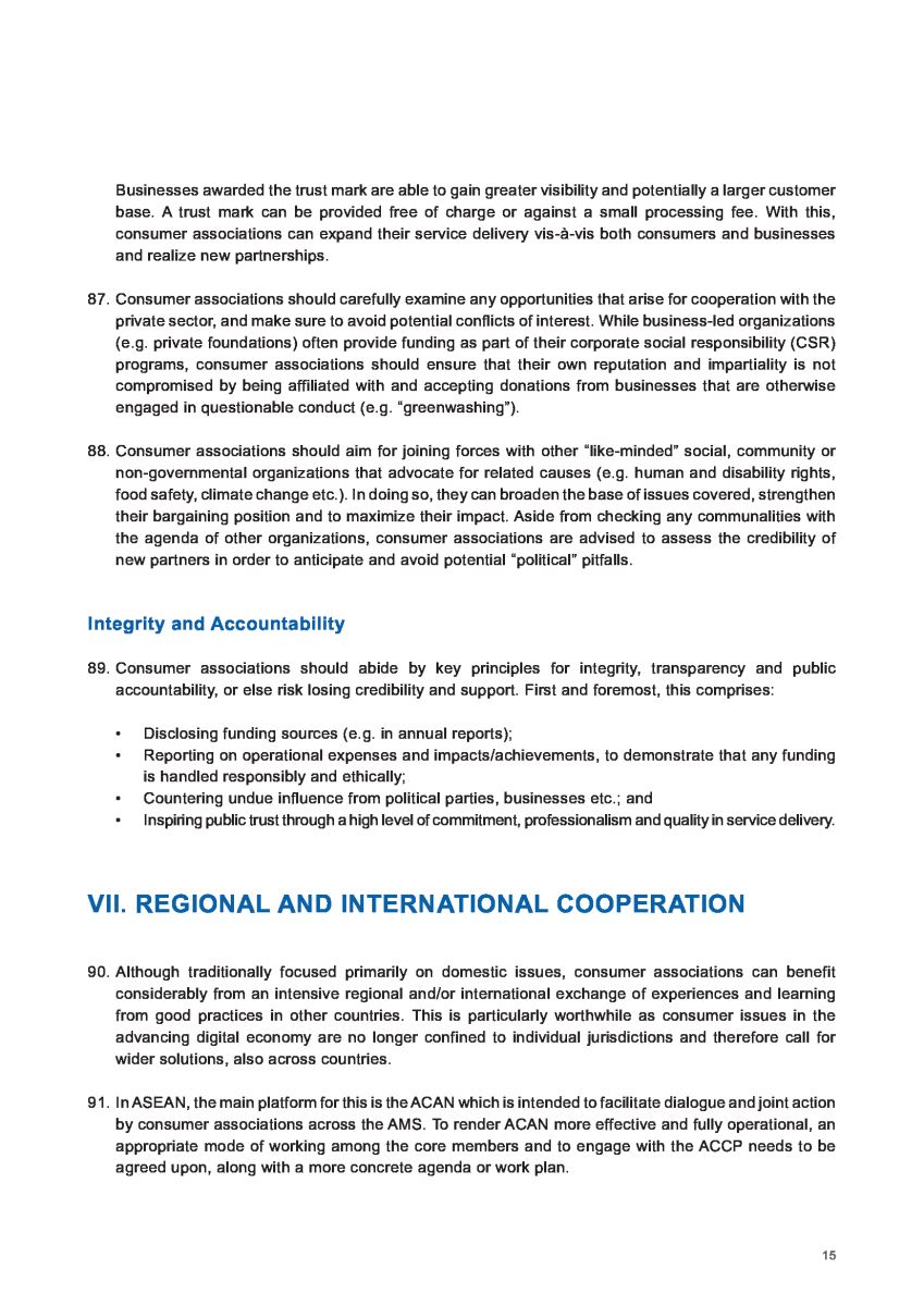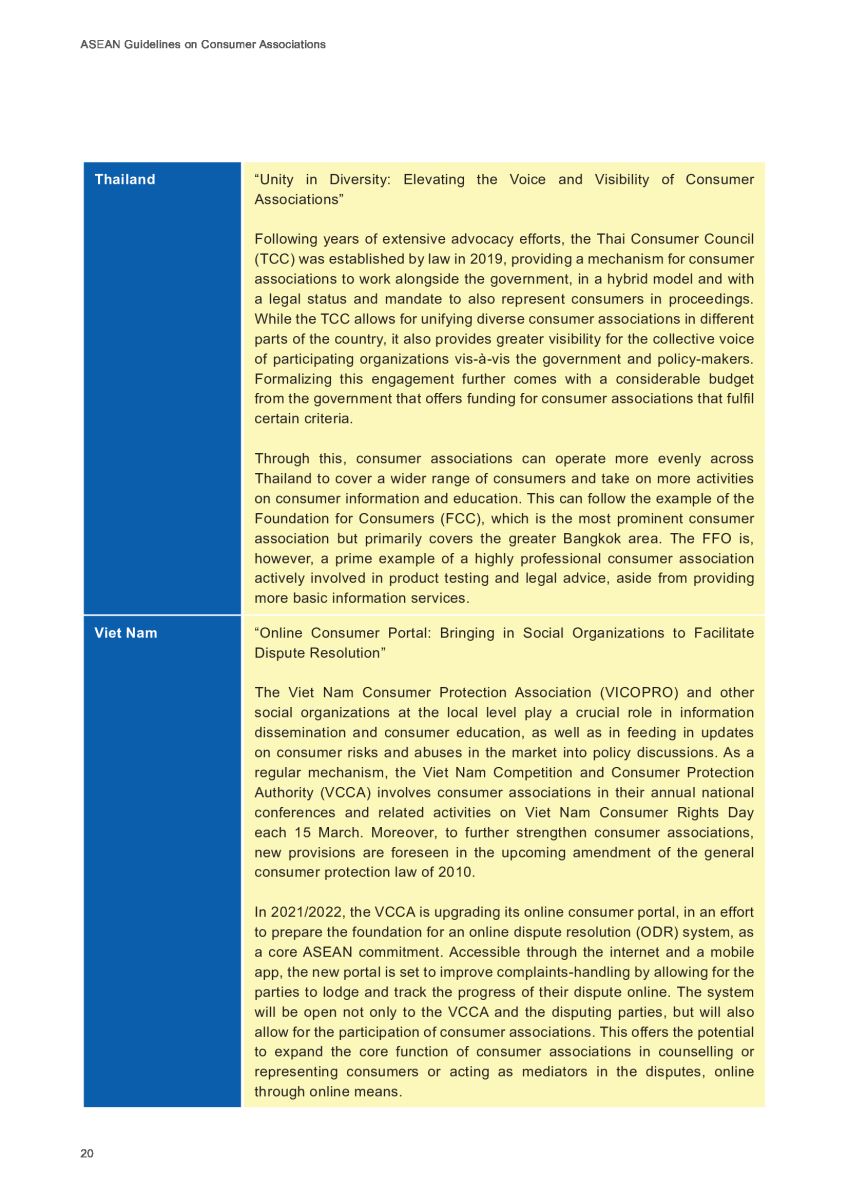 Theo Hướng dẫn của Liên hợp quốc về Bảo vệ người tiêu dùng, các Chính phủ ở ASEAN được khuyến khích, thúc đẩy tạo môi trường thuận lợi cho công việc của các tổ chức xã hội tham gia bảo vệ người tiêu dùng để các tổ chức này có thể hỗ trợ cho cộng đồng người tiêu dùng.