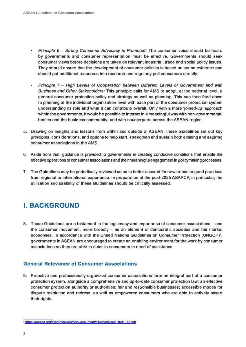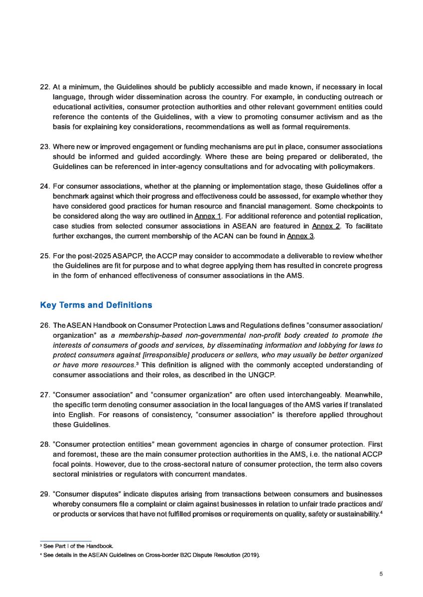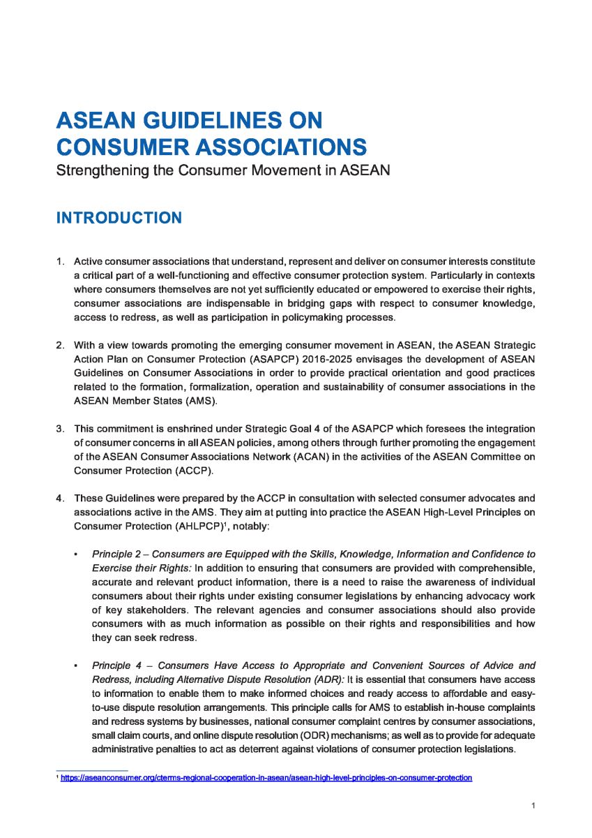 Cục Cạnh tranh và Bảo vệ người tiêu dùng cho biết, các Hướng dẫn này được ACCP soạn thảo với sự tham vấn của những tổ chức, cá nhân ủng hộ người tiêu dùng, các hiệp hội, hội và các tổ chức bảo vệ người tiêu dùng đang hoạt động tại các nước thành viên; hướng tới việc áp dụng các Nguyên tắc cấp cao ASEAN về bảo vệ người tiêu dùng.