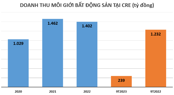 Xét riêng doanh thu mảng môi giới bất động sản trong 9 tháng đầu năm 2023, CenLand có doanh thu mảng môi giới cao nhất với 239 tỷ đồng, giảm mạnh 81% so với cùng kỳ và cuối cùng là Khải Hoàn Land với gần 47 tỷ đồng, giảm sốc 92% so với cùng kỳ.