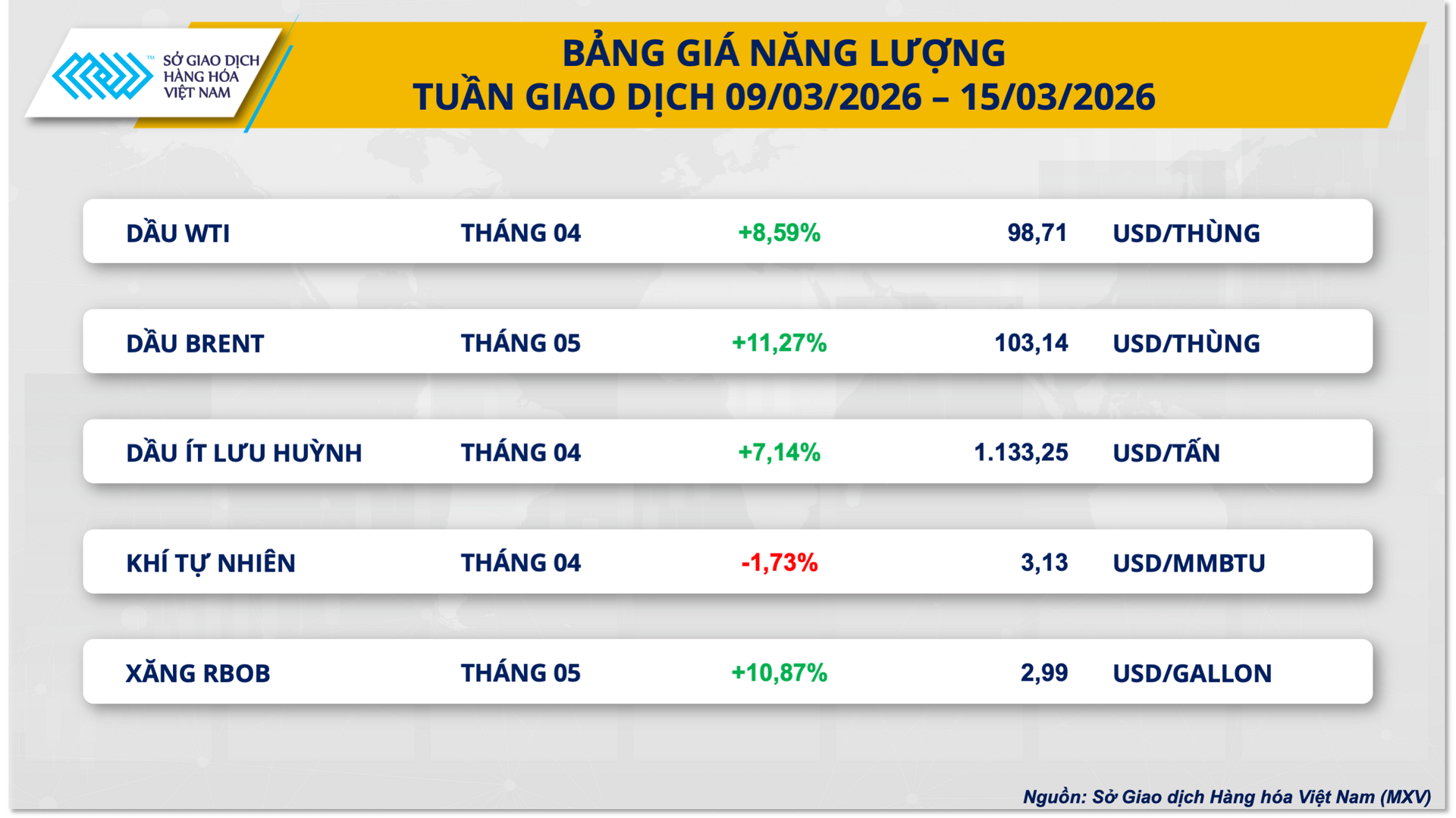Theo dữ liệu từ Sở Giao dịch Hàng hóa Việt Nam (MXV), thị trường năng lượng thế giới tiếp tục “nóng” trong tuần thứ hai liên tiếp khi căng thẳng địa chính trị tại Trung Đông chưa có dấu hiệu hạ nhiệt. Kết thúc phiên giao dịch cuối tuần qua (13/3), giá dầu thô Brent tăng vọt 11,3% so với tuần trước, lên mức 103,14 USD/thùng; trong khi dầu WTI tăng 8,6%, đạt 98,7 USD/thùng.