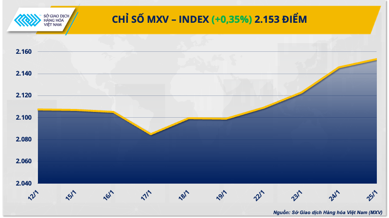 Số liệu từ Sở Giao dịch Hàng hóa Việt Nam (MXV) cho thấy, kết thúc ngày giao dịch hôm qua (25/1), diễn biến giá hàng hoá nguyên liệu tương đối phân hoá. Trái với sắc đỏ chiếm ưu thế trên bảng giá nhóm nguyên liệu công nghiệp và nông sản, sắc xanh bao phủ các mặt hàng nhóm năng lượng và kim loại. Chỉ số MXV-Index tăng 0,35% lên 2.153 đi