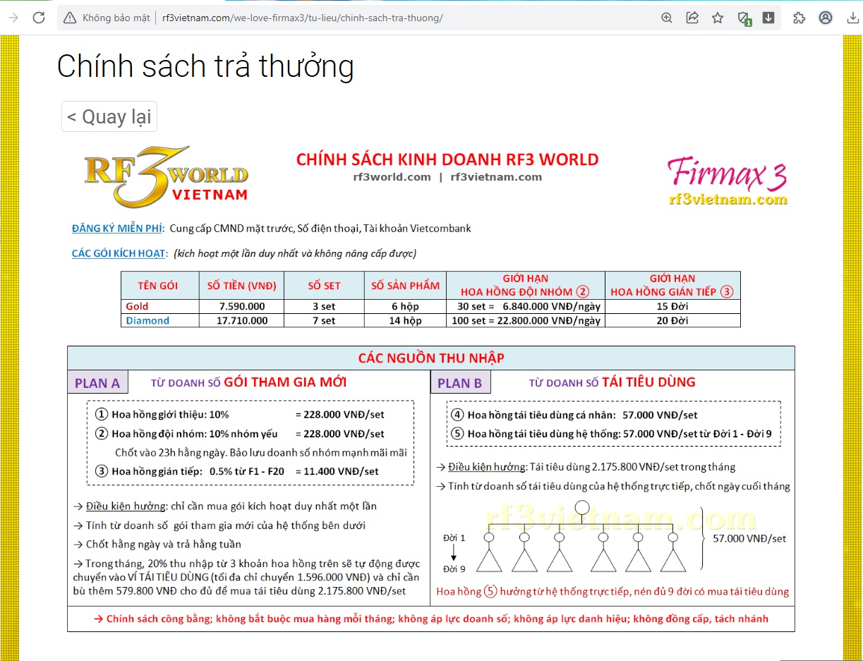 Ủy ban Cạnh tranh Quốc gia cho biết, cơ quan này nhận thấy một số cá nhân, tổ chức thực hiện kêu gọi đầu tư, kinh doanh mua bán hàng hóa có dấu hiệu hoạt động kinh doanh theo phương thức đa cấp không có giấy chứng nhận hợp pháp tại Việt Nam có tên RF3WORLD thông qua các website như www.Rf3worldvietnam.com, www.Rf3vietnam.com hay www.Firmax3vn.com.vn.