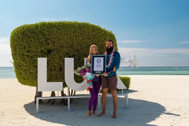 Nụ hôn dài 4 phút 6 giây giữa Beth Neale, 40 tuổi, đến từ Nam Phi, và hôn phu của cô, Miles Cloutier, 33 tuổi, đến từ Canada, được thực hiện tại đảo Maldives hôm 4/2.