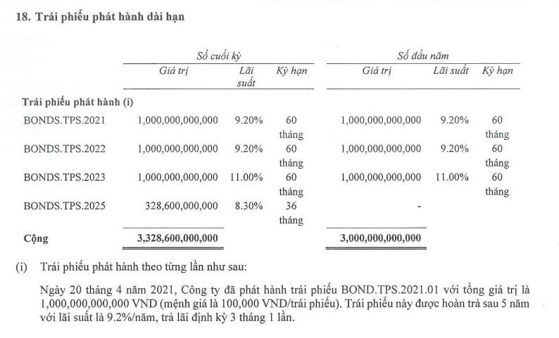 Ngoài ra, TPS còn có 4 lô trái phiếu phát hành các năm 2021, 2022, 2023 và 2025 với tổng giá trị hơn 3.328 tỷ đồng.