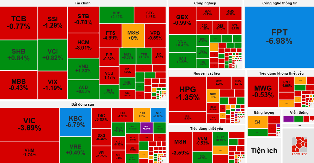 Nhóm công nghệ dẫn đầu đà giảm với mức sụt 6,91%, chịu tác động mạnh từ cổ phiếu FPT khi chạm sàn và CMG giảm 5,46%. Nhóm bất động sản cũng góp phần kéo thị trường đi xuống, giảm 2,18%, với các mã lớn như VIC (-3,69%), VHM (-1,74%) và KBC (-6,79%) chịu áp lực nặng nề.