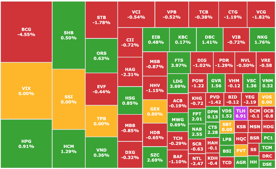 Đến cuối phiên, VN-Index giảm nhẹ 0,2 điểm (0,02%), chốt ở mức 1.302,96 điểm. Toàn sàn HoSE có 198 mã tăng, 259 mã giảm và 70 mã đứng giá. Ngược lại, HNX-Index lên nhẹ 0,29 điểm (0,12%), đạt 238,6 điểm với 98 mã tăng, 81 mã giảm và 57 mã đứng giá.