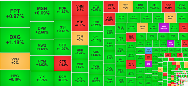 Nhìn chung, tâm lý nhà đầu tư dần được cải thiện sau các tín hiệu tích cực từ nền kinh tế và các chính sách hỗ trợ của chính phủ. Các lĩnh vực như bất động sản và ngân hàng đã thu hút được sự quan tâm lớn, với nhiều cổ phiếu ghi nhận mức tăng kỷ lục trong phiên giao dịch này.