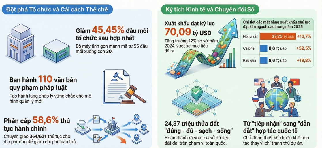 Năm 2025, xuất khẩu nông, lâm, thủy sản đạt kỷ lục trên 70 tỷ USD, khẳng định vai trò trụ đỡ của nông nghiệp trong bối cảnh kinh tế toàn cầu nhiều biến động. Kết quả này phản ánh năng lực tổ chức sản xuất, khả năng thích ứng thị trường và sức cạnh tranh ngày càng nâng cao của nông nghiệp Việt Nam.