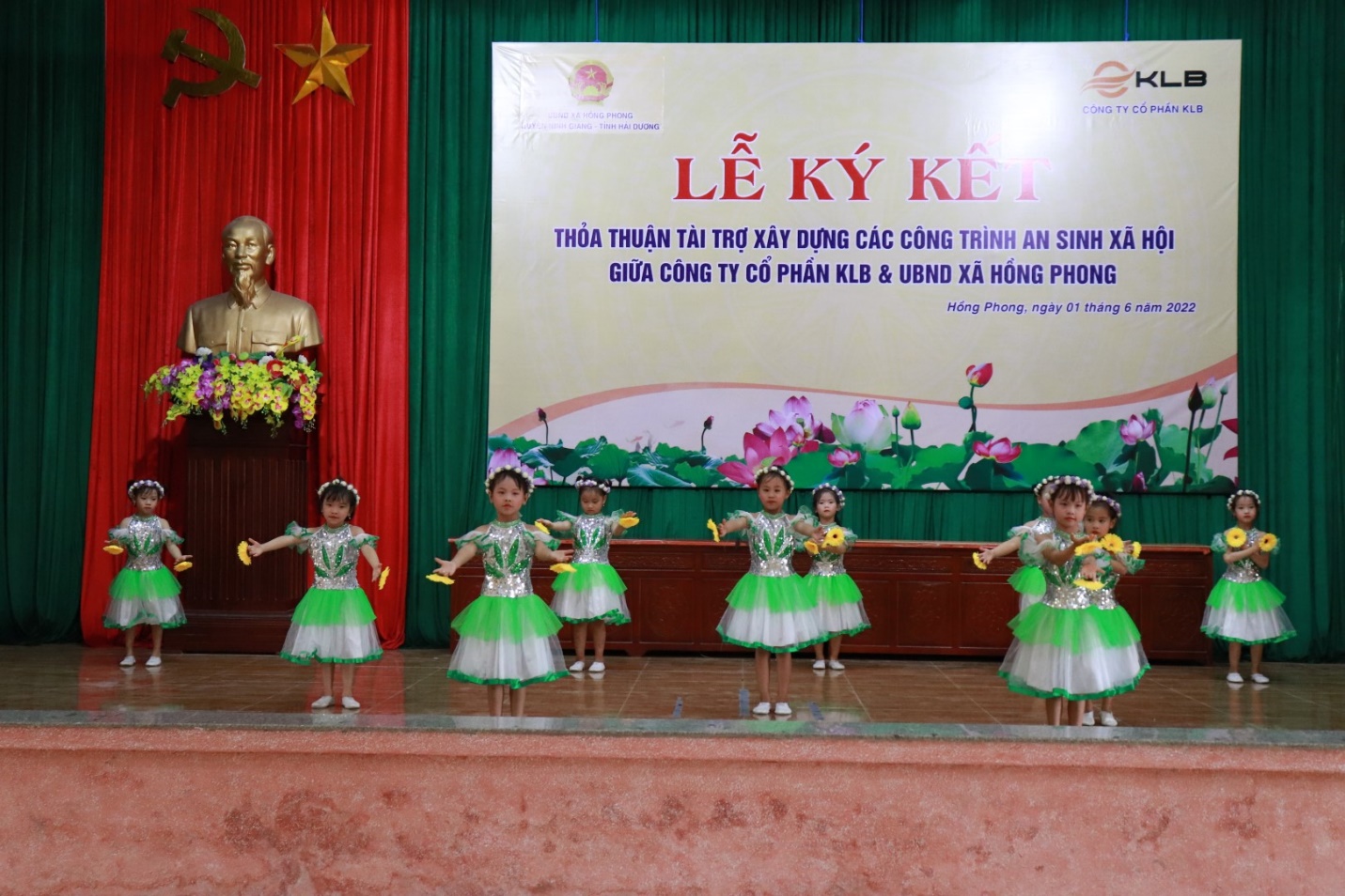 Tiết mục văn nghệ chào mừng của giáo viên và các em nhỏ Trường Mầm non xã Hồng Phong – một trong những đơn vị thụ hưởng của thỏa thuận tài trợ lần này