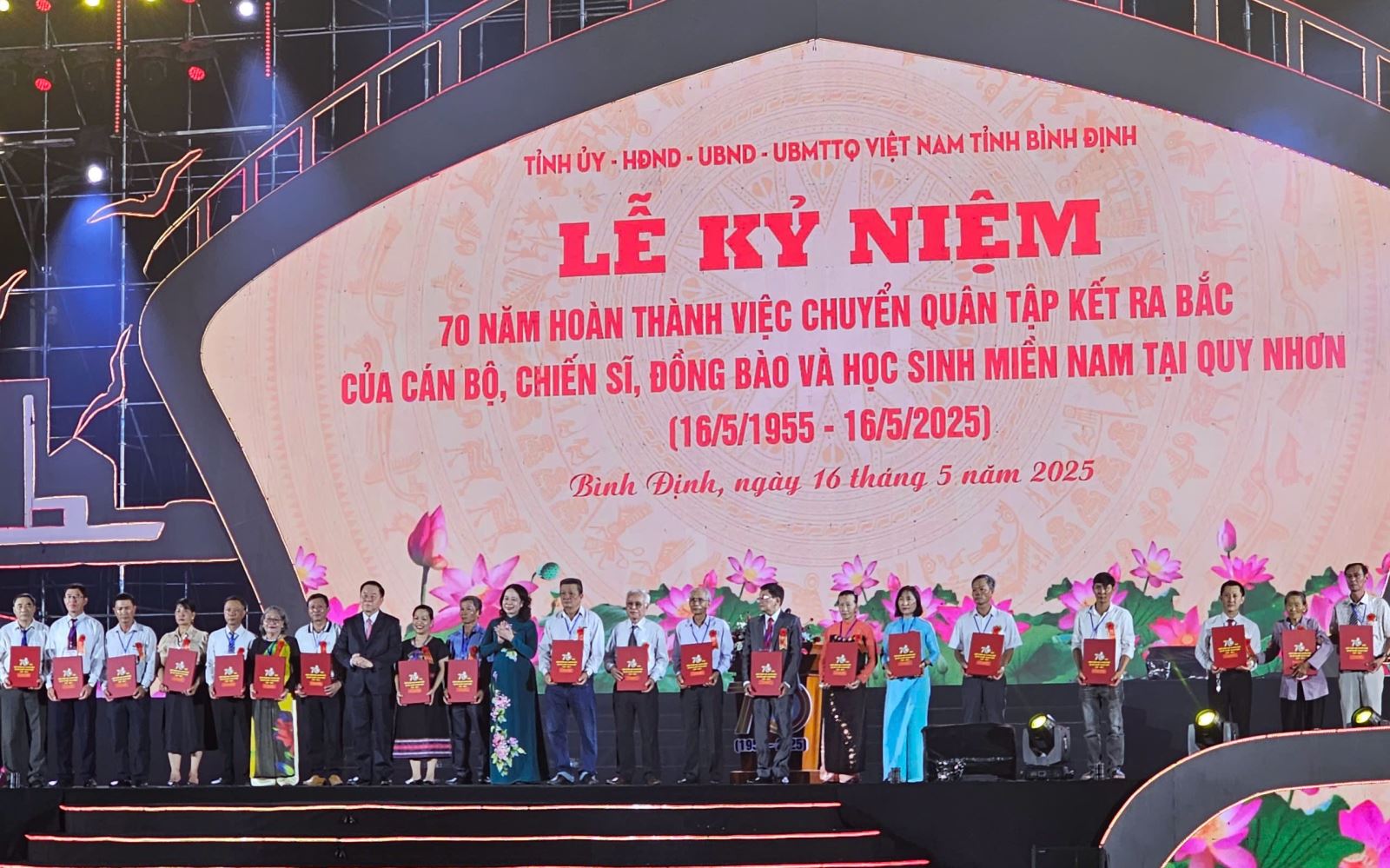 Tối 16/5, tại Quảng trường Nguyễn Tất Thành (TP. Quy Nhơn), tỉnh Bình Định long trọng tổ chức Lễ kỷ niệm 70 năm hoàn thành việc chuyển quân tập kết ra Bắc của cán bộ, chiến sĩ, đồng bào và học sinh miền Nam tại Quy Nhơn (16/5/1955 - 16/5/2025) và nhận Bằng Di tích quốc gia “Cảng Quy Nhơn - Địa điểm 300 ngày chuyển quân tập kết ra Bắc”.