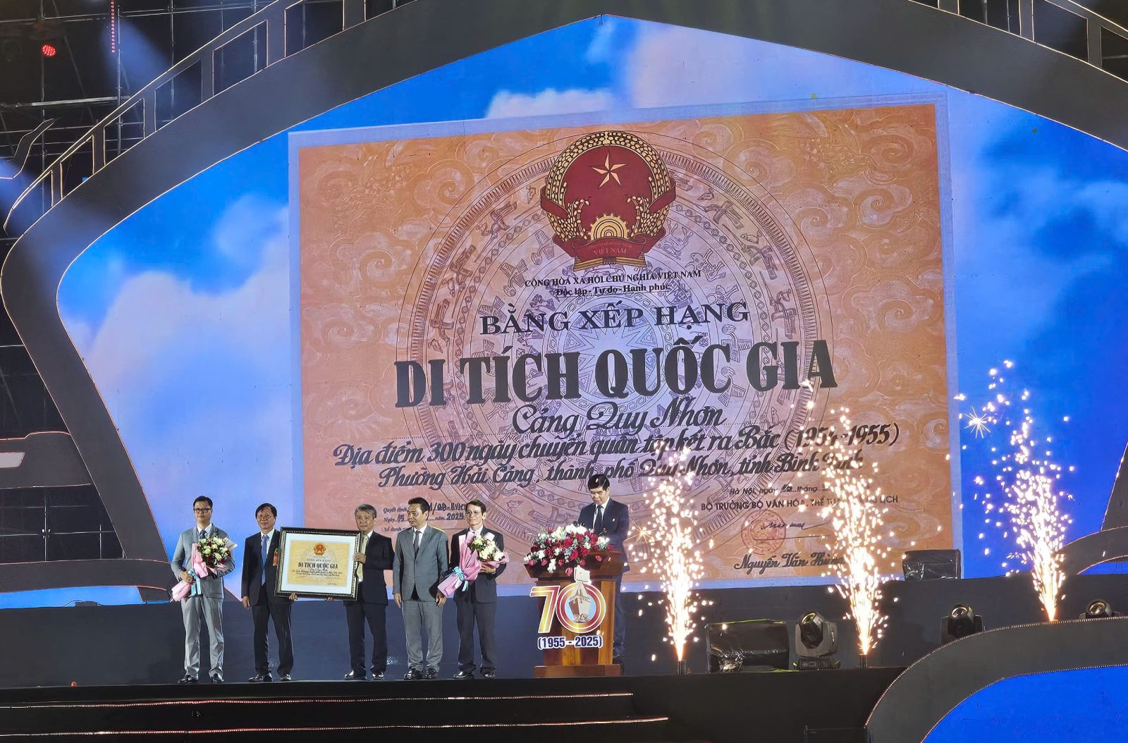 Cùng đó, Thứ trưởng Bộ Văn hóa, Thể thao và Du lịch Hoàng Đạo Cương trao Bằng Di tích quốc gia “Cảng Quy Nhơn - Địa điểm 300 ngày chuyển quân tập kết ra Bắc” cho lãnh đạo thành phố Quy Nhơn. Đây là niềm tự hào to lớn, là sự ghi nhận đối với những đóng góp của Đảng bộ và Nhân dân tỉnh Bình Định trong hành trình đấu tranh giải phóng dân tộc, thống nhất nước nhà.