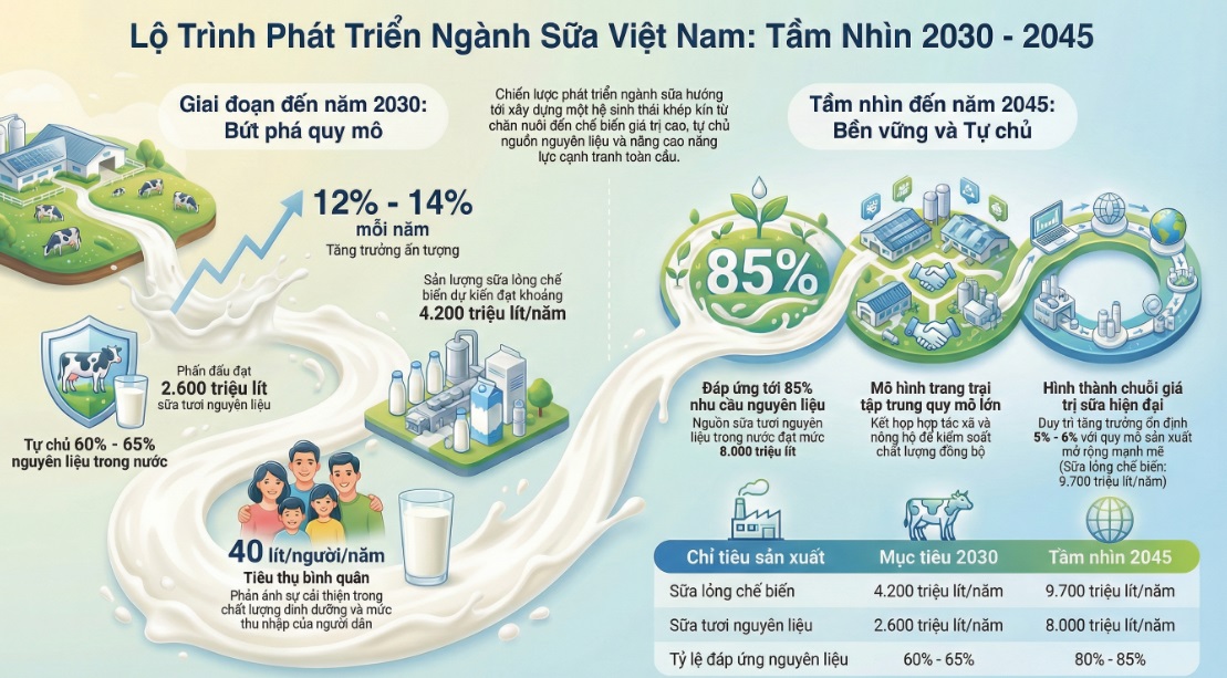 Chiến lược phát triển ngành sữa đến năm 2030, tầm nhìn 2045 đặt ra mục tiêu tái cấu trúc toàn diện từ chăn nuôi, chế biến đến thị trường tiêu thụ, hướng tới xây dựng ngành sữa Việt Nam hiện đại, tự chủ nguyên liệu, gia tăng giá trị và tham gia sâu hơn vào chuỗi cung ứng toàn cầu.