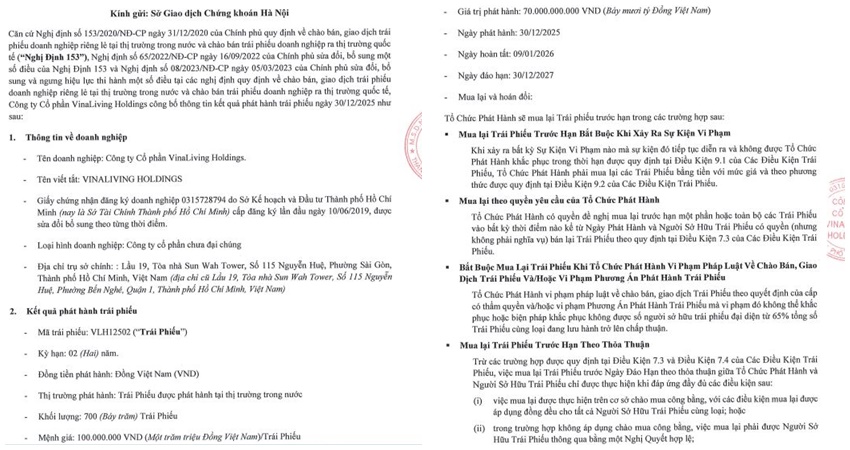 Cùng ngày, VinaLiving đã phát hành 700 trái phiếu mã VLH12502 nhưng tới 09/01/2026 mới hoàn tất. Với mệnh giá 100 triệu đồng/trái phiếu, tương ứng giá trị phát hành 70 tỷ đồng. Trái phiếu có kỳ hạn 02 năm, dự kiến đáo hạn vào ngày 30/12/2027, lãi suất cố định 11%/năm.