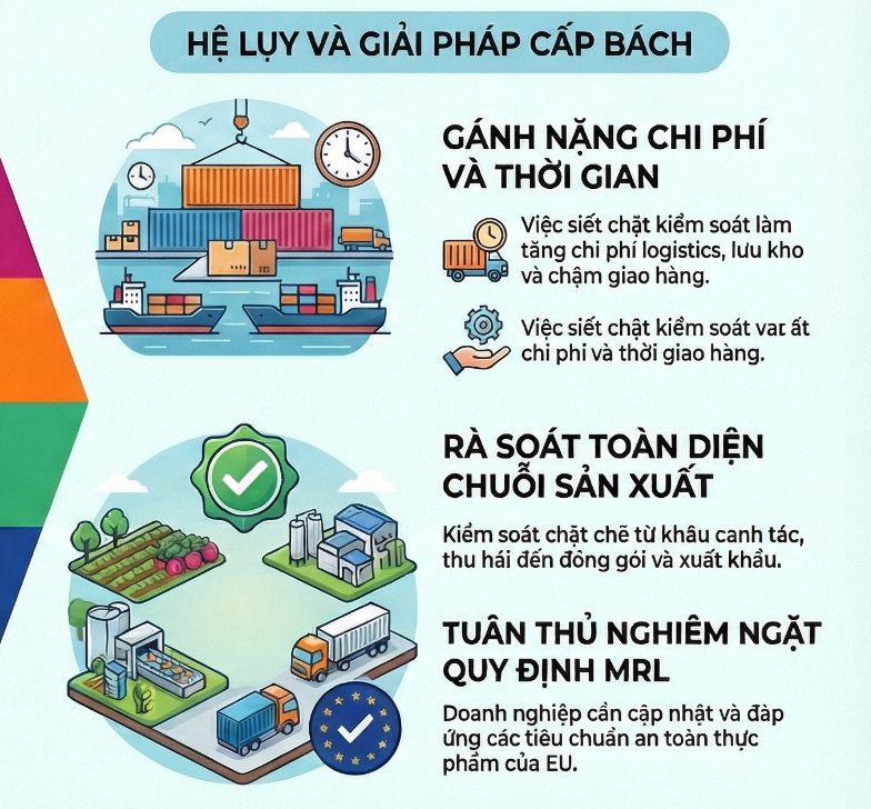 Các biện pháp này kéo theo sự gia tăng đáng kể của chi phí logistics, chi phí kiểm nghiệm và chi phí lưu kho. Đồng thời, rủi ro chậm giao hàng tăng lên, ảnh hưởng đến kế hoạch kinh doanh và cam kết với đối tác. Uy tín của doanh nghiệp cũng bị tác động khi lô hàng bị kiểm tra hoặc phát hiện vi phạm.