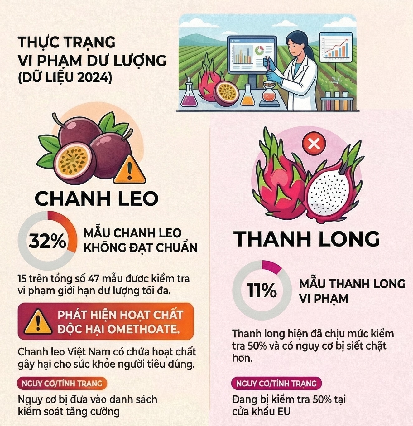 Đáng chú ý, mặt hàng chanh leo có tỷ lệ vi phạm cao. Trong số 47 mẫu được kiểm tra, có 15 mẫu vi phạm giới hạn dư lượng tối đa (MRL), tương đương 32%. Ngoài ra, có trường hợp phát hiện hoạt chất omethoate. Đối với thanh long, tỷ lệ vi phạm là 11% (1/9 mẫu). Hiện nay, thanh long Việt Nam đã nằm trong Phụ lục I của Quy định (EU) 2019/1793 và đang chịu tần suất kiểm tra tại cửa khẩu EU lên tới 50%.