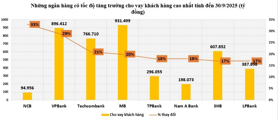 Tính đến cuối tháng 9/2025, ngân hàng Quốc dân (NCB) có số dư cho vay khách hàng cao nhất 33% so với đầu năm, đạt 94.956 tỷ đồng.