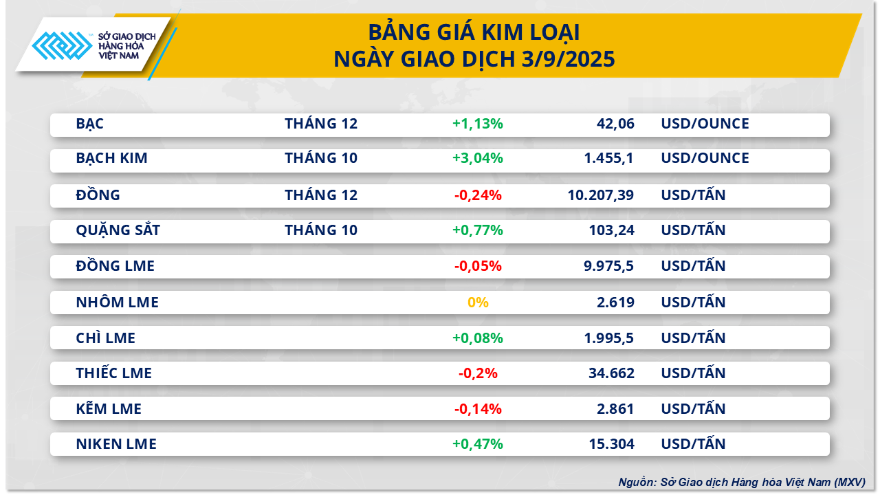 Khép lại phiên giao dịch ngày hôm qua, thị trường kim loại chứng kiến sắc xanh đỏ đan xen trên bảng giá. Đáng chú ý, giá bạc ghi nhận mức tăng tới hơn 1,13%, đạt mức 42 USD/ounce, đánh dấu lần đầu tiên giá mặt hàng này vượt ngưỡng này trong vòng 14 năm trở lại đây. Theo MXV, thị trường hiện đang đặt kỳ vọng vào việc FED sẽ cắt giảm lãi suất trong tháng này, khiến nhu cầu trú ẩn gia tăng mạnh ở các mặt hàng kim loại quý.