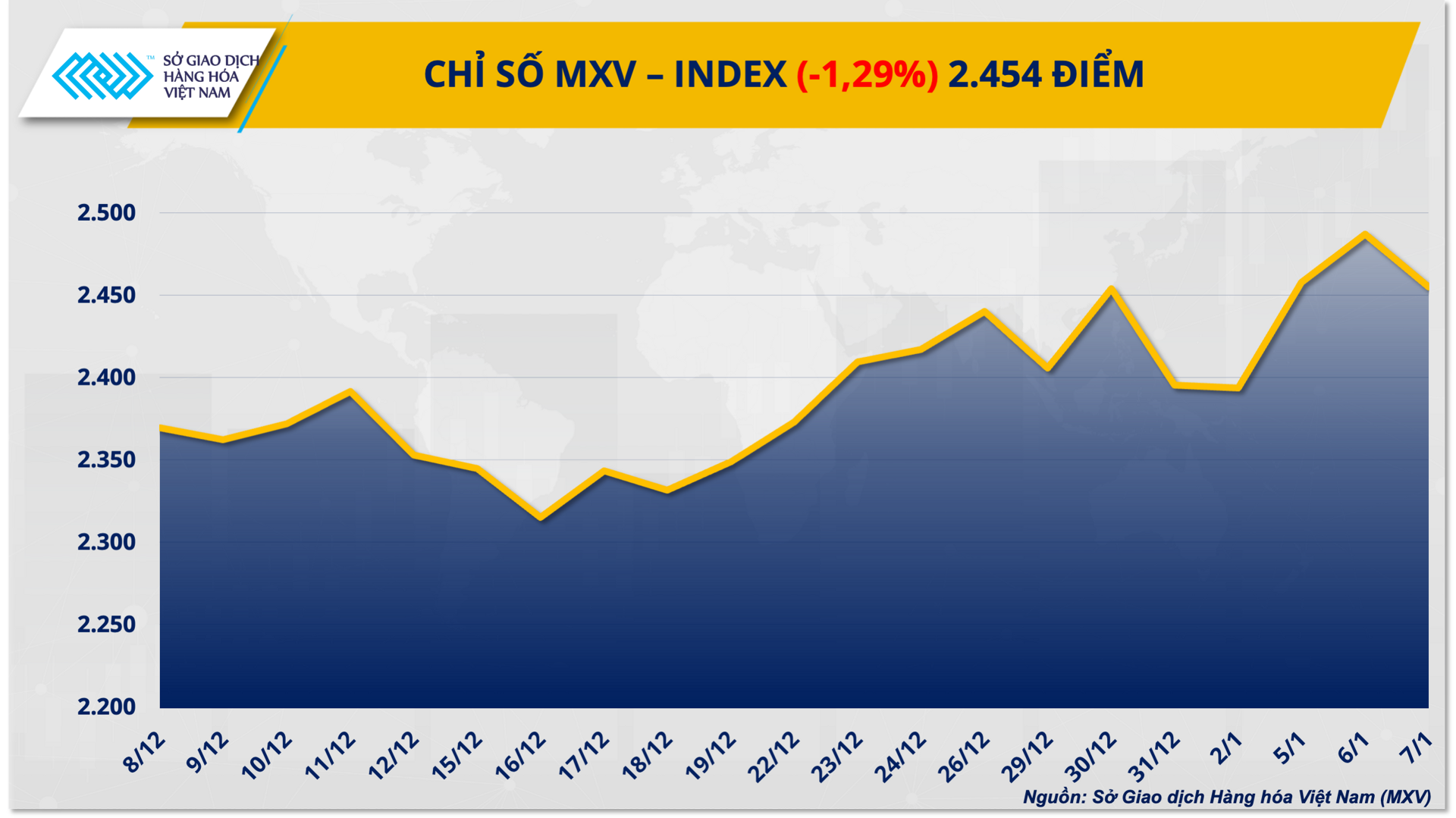 Tâm điểm đổ dồn vào đà giảm sâu của giá bạch kim khi thị trường dự báo chuyển sang trạng thái thặng dư, đối lập hoàn toàn với nhịp tăng mạnh của nhóm nông sản trước những lo ngại về nguồn cung lúa mì mùa đông tại Mỹ. Chốt phiên, chỉ số MXV-Index giảm gần 1,35% xuống mức 2.454 điểm.