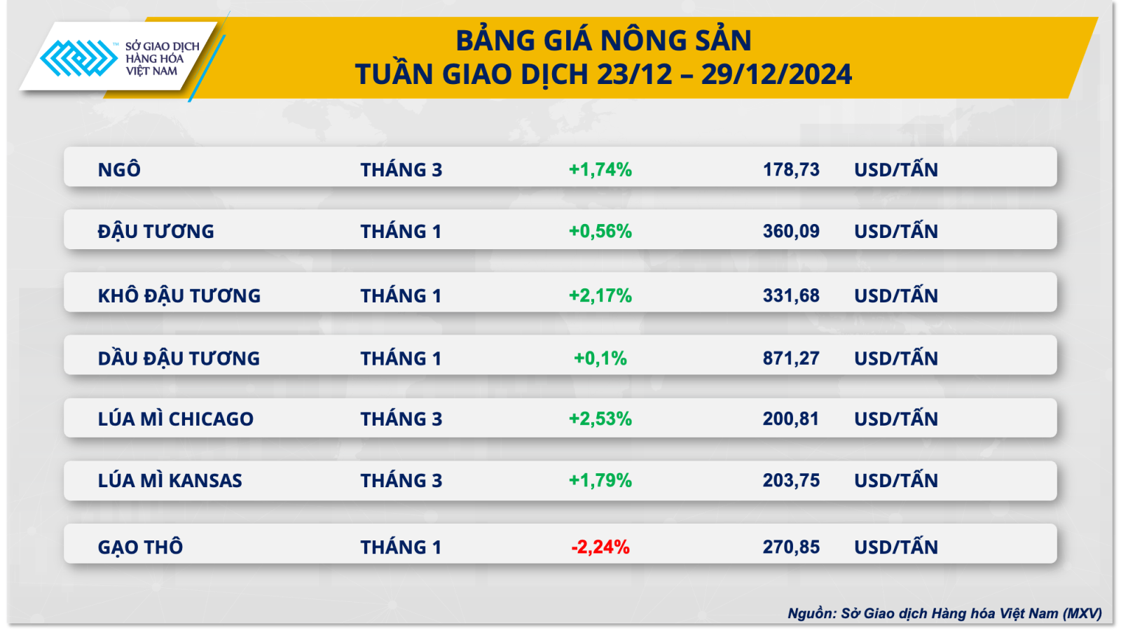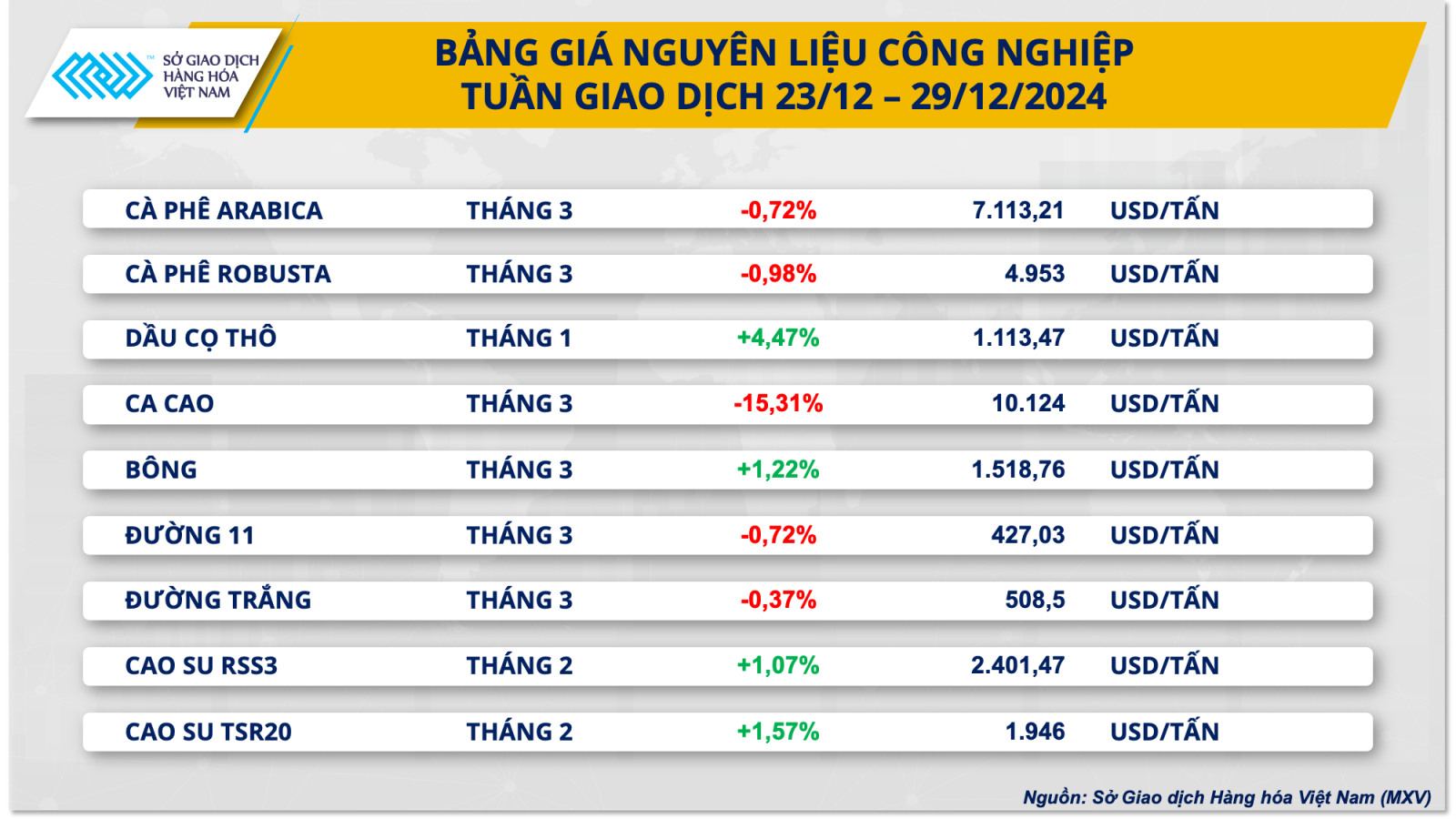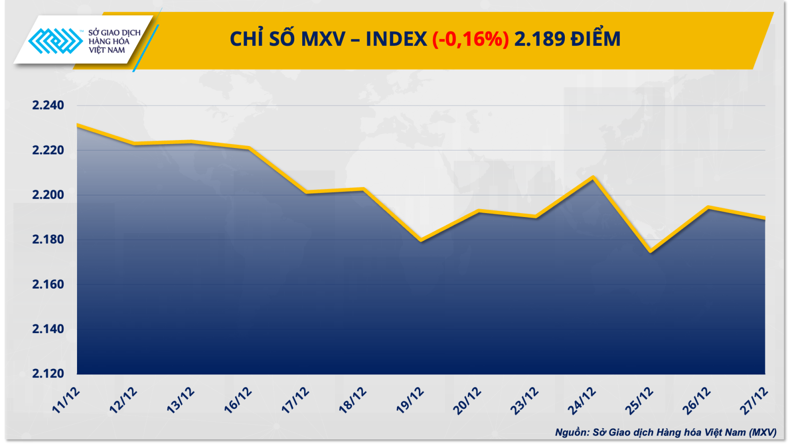Theo Sở Giao dịch hàng hóa Việt Nam (MXV), lực bán chiếm ưu thế trên thị trường hàng hóa nguyên liệu thế giới trong tuần qua (23 - 29/12), kéo chỉ số MXV-Index giảm nhẹ 0,16% xuống 2.189 điểm.