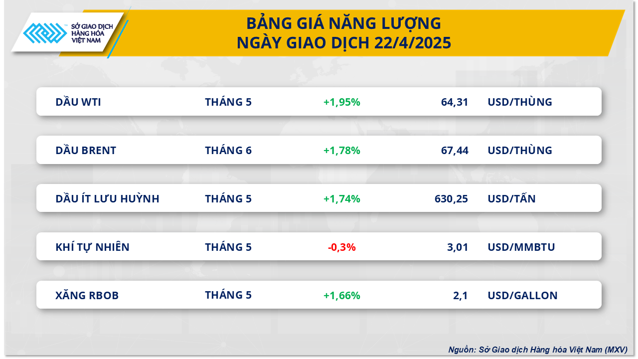 Kết thúc phiên giao dịch; giá dầu Brent đã tăng 1,78%, lên mốc 67,44 USD/thùng. Trong khi đó, giá dầu WTI hợp đồng tháng 5 cũng ghi nhận mức tăng 1,95%, lên mốc 64,31 USD/thùng, trong phiên giao dịch cuối cùng trước khi hợp đồng này hết hạn.