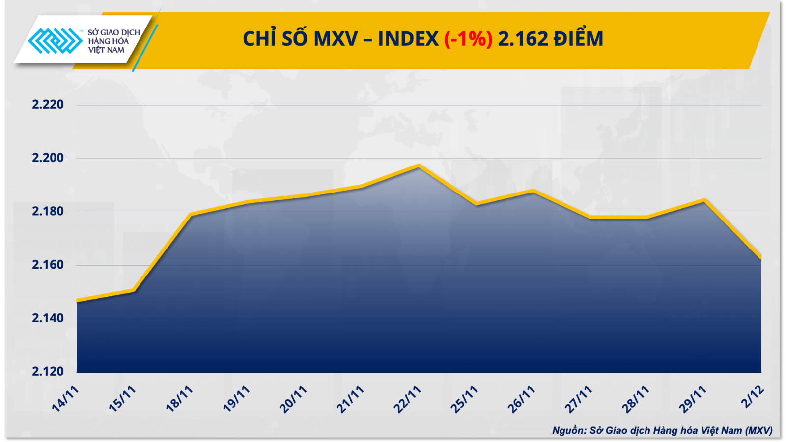Theo Sở Giao dịch Hàng hóa Việt Nam (MXV), thị trường hàng hóa nguyên liệu thế giới chìm trong sắc đỏ trong phiên giao dịch đầu tuần (2/12). Lực bán mạnh mẽ đã kéo chỉ số MXV-Index đóng cửa giảm 1% xuống 2.162 điểm.
