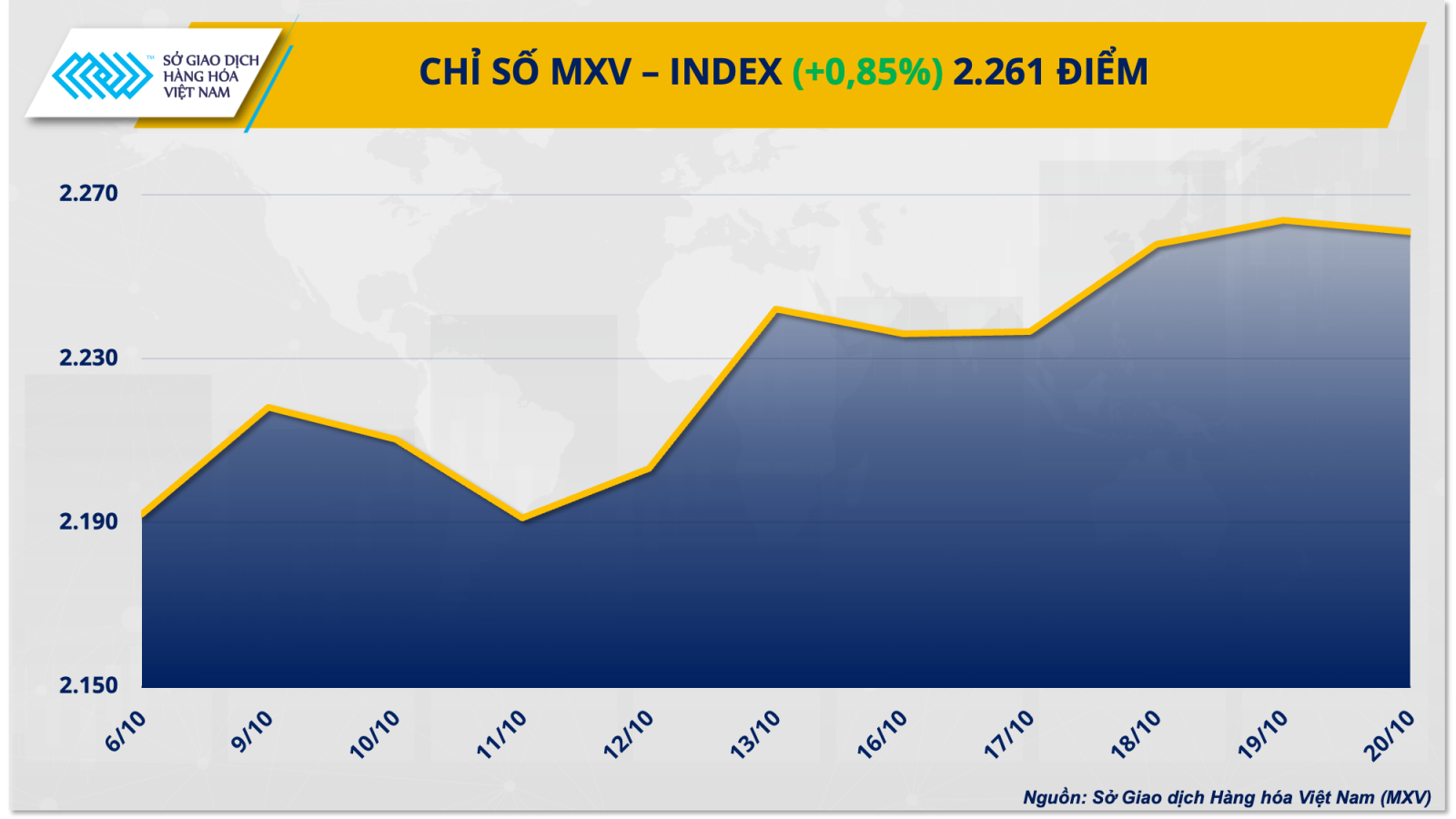 Chỉ số MXV-Index chốt tuần tăng 0,85% lên mức 2.261 điểm. Trong khi đó, dòng tiền đổ vào thị trường đang tăng dần đều theo từng phiên, giúp giá trị giao dịch trung bình cả tuần tăng 14% so với tuần trước đó, đạt trên 4.200 tỷ đồng mỗi ngày.