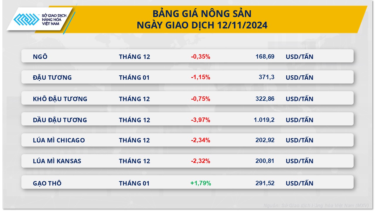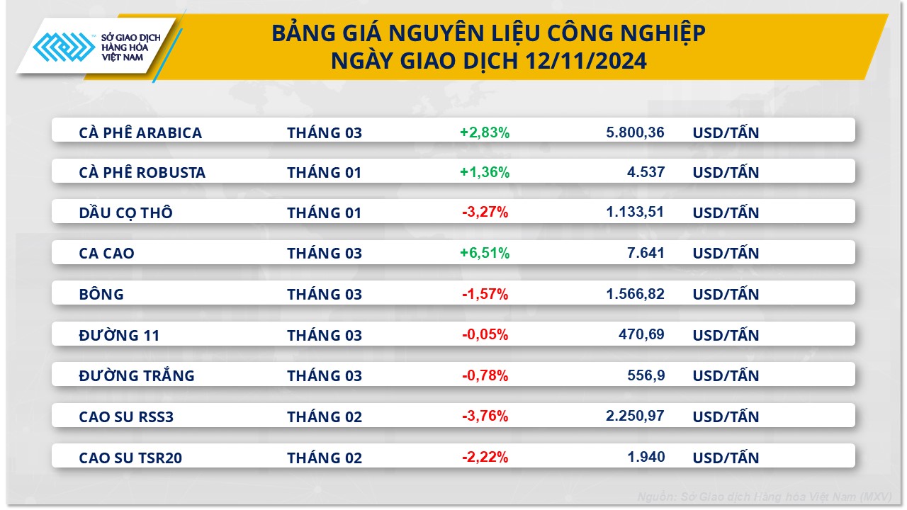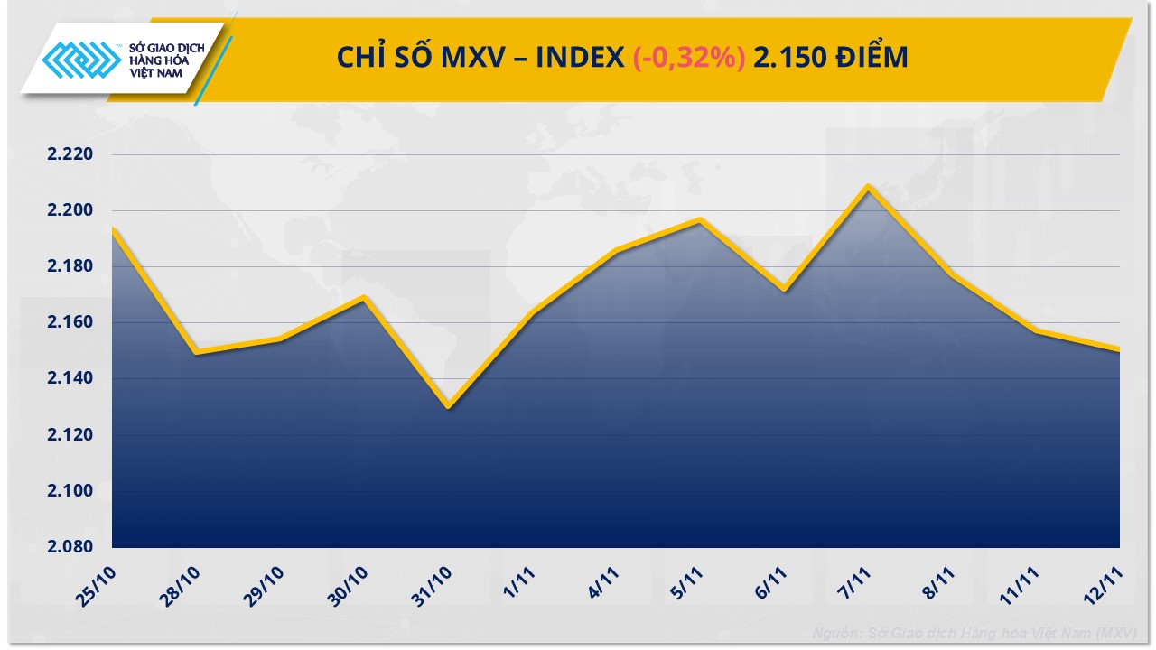Theo Sở Giao dịch Hàng hóa Việt Nam (MXV), đóng cửa ngày 12/11, thị trường hàng hóa nguyên liệu thế giới phân hóa rõ nét. Tuy nhiên, lực bán chiếm ưu thế đã đẩy chỉ số MXV-Index rơi nhẹ 0,32% xuống 2.150 điểm.