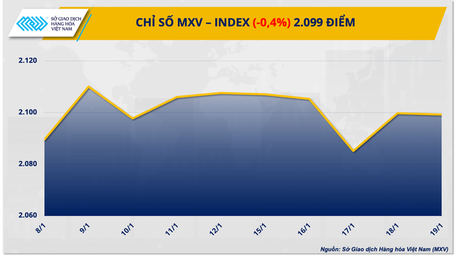 Đóng cửa tuần (19/1), bảng giá nông sản chìm trong sắc đỏ, trong khi giá nhiều mặt hàng nhóm nguyên liệu công nghiệp lại đi lên. Chỉ số MXV-Index hạ 0,4% xuống 2.099 điểm. Đầu tuần trước, thị trường giao dịch Mỹ nghỉ lễ Martin Luther King, giá trị giao dịch giảm mạnh nhưng ngay sau đó đã sôi động trở lại. Giá trị giao dịch trung bình vẫn ở mức hơn 4.600 tỷ đồng mỗi ngày.