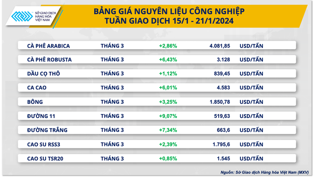 Kết thúc tuần giao dịch 15-21/1, sắc xanh bao phủ trên bảng giá các mặt hàng nhóm nguyên liệu công nghiệp. Trong đó, giá Robusta tăng mạnh 6,43%, tiến tới vùng cao nhất trong 16 năm. Lo ngại căng thẳng Biển Đỏ leo thang làm gián đoạn hoạt động cung ứng giữa các nước sản xuất và tiêu thụ Robusta hàng đầu thế giới đã đẩy giá tăng mạnh.