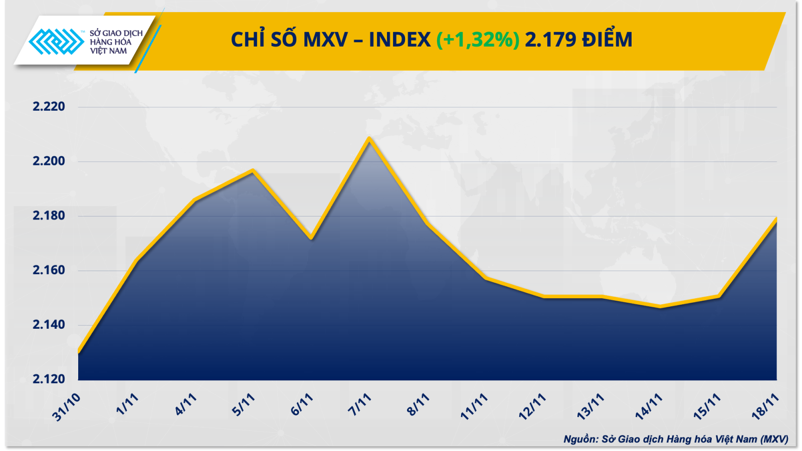 Bên cạnh đó, thị trường kim loại cũng ghi nhận diễn biến tích cực với sự phục hồi của bạc và bạch kim. Đóng cửa, chỉ số MXV-Index tăng 1,32% lên 2.179 điểm.