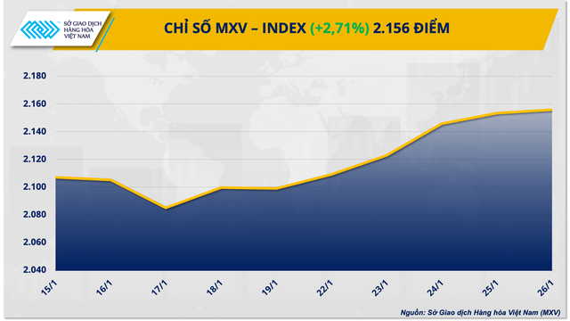 Số liệu từ Sở Giao dịch hàng hóa Việt Nam (MXV) cho thấy lực mua áp đảo trên thị trường hàng hoá nguyên liệu trong tuần 22-28/1.
