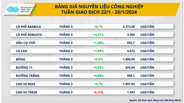 Kết thúc tuần giao dịch 22-28/1, sắc xanh áp đảo trên bảng giá các mặt hàng nhóm nguyên liệu công nghiệp. Trong đó, giá Robusta tăng 4,51%, mức cao nhất trong 16 năm qua. Lo ngại thiếu hụt nguồn cung trên thị trường gia tăng khi căng thẳng trên Biển Đỏ kéo dài và tồn kho quay về mức thấp kỷ lục. Bên cạnh đó, tồn kho Robusta trên Sở ICE-EU tính đến hết ngày 25/1 ở mức 30.080 tấn, quay về mức thấp nhất kể từ 2014.