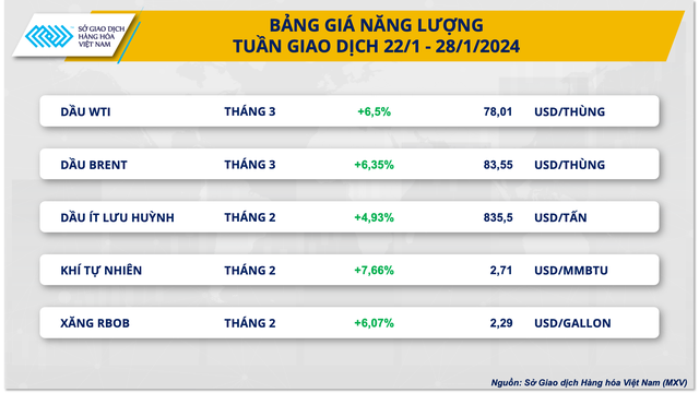 Theo MXV, kết thúc tuần giao dịch 22-28/1, toàn bộ 5 mặt hàng trong nhóm năng lượng đều tăng giá mạnh. Trong đó, giá dầu WTI tăng 6,5% lên 78 USD/thùng, ghi nhận mức cao nhất trong hai tháng qua. Dầu Brent chốt tuần với mức giá 83,55 USD/thùng, cao hơn 6,35% so với tuần trước đó.