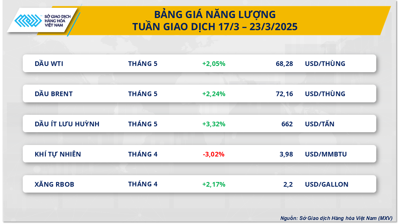 Thị trường năng lượng vừa khép lại tuần tăng giá thứ hai liên tiếp trong tháng 3/2025, với sự hỗ trợ từ căng thẳng địa chính trị tại Trung Đông và các động thái cắt giảm sản lượng của nhóm OPEC+.