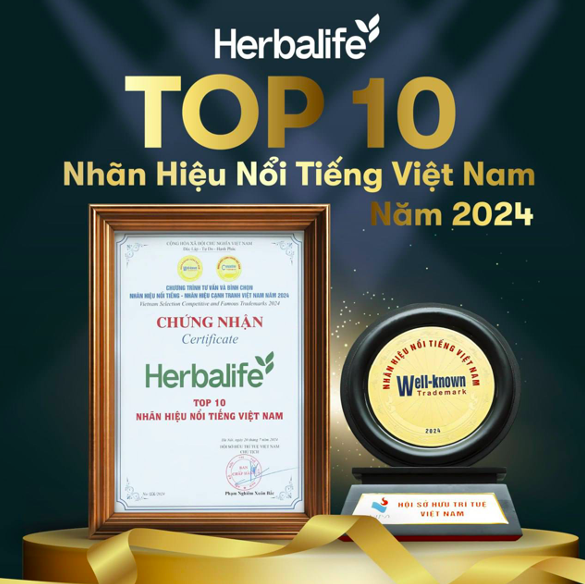 Herbalife Việt Nam, một trong những công ty hàng đầu về sức khỏe và thể chất, đã vinh dự được Hội Sở Hữu Trí Tuệ Việt Nam công nhận là thương hiệu danh tiếng tại Việt Nam năm 2024 với Chứng nhận Top 10 Nhãn Hiệu Nổi Tiếng Việt Nam.