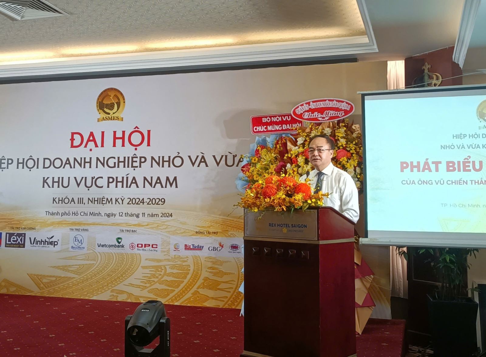 Thứ trưởng Vũ Chiến Thắng phát biểu chỉ đạo Đại hội, “Hiệp hội đã phát triển mạnh mẽ từ lúc thành lập và đóng vai trò quan trọng trong việc hỗ trợ doanh nghiệp nhỏ và vừa phát triển kinh tế khu vực phía Nam. Trong nhiệm kỳ này, đề nghị Hiệp hội nghiêm túc thực hiện các nhiệm vụ như hoàn thiện hồ sơ báo cáo kết quả đại hội, kiện toàn cơ cấu tổ chức và nâng cao vai trò quản lý của Ban chấp hành”.