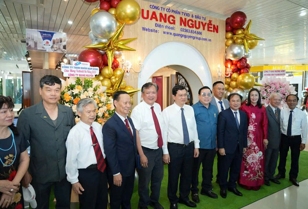 Lãnh đạo Bộ Xây dựng, UBND TP. Đà Nẵng và Hội Vật liệu xây dựng Việt Nam chụp hình lưu niệm tại gian hàng trưng bày của Công ty CP TVXD & Đầu tư Quang Nguyễn