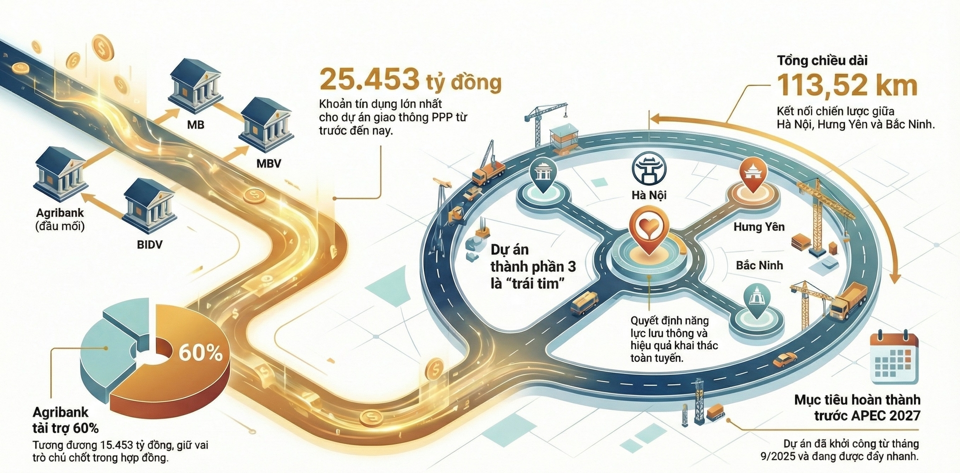 Nguồn vốn tín dụng được cung cấp bởi liên danh bốn ngân hàng trong nước gồm Agribank, MB, BIDV và MBV. Trong tổng nhu cầu huy động 29.944 tỷ đồng của các nhà đầu tư Dự án thành phần 3, phần vốn tín dụng chiếm tỷ trọng chủ đạo, qua đó tạo nền tảng tài chính vững chắc cho quá trình thi công, quản lý và vận hành dự án theo mô hình PPP. Việc ký kết hợp đồng tín dụng diễn ra trước sự chứng kiến của Phó Thủ tướng Chính phủ Hồ Đức Phớc, thể hiện sự quan tâm và chỉ đạo sát sao của Chính phủ đối với các dự án hạ tầng then chốt của Vùng Thủ đô.