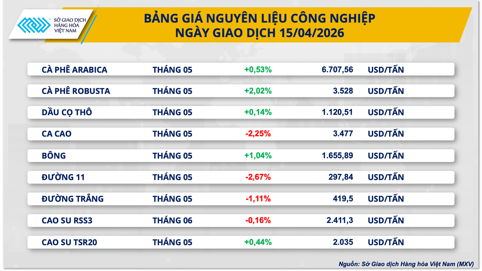 Thị trường hàng hóa nguyên liệu thế giới ghi nhận diễn biến tích cực trong phiên giao dịch ngày 15/4 khi lực mua quay trở lại trên diện rộng, nhất là tại nhóm nguyên liệu công nghiệp và nông sản. Đóng cửa, chỉ số MXV-Index tăng 0,5% lên mức 2.818 điểm .