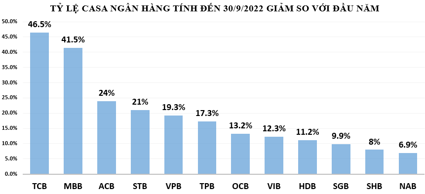 Kết thúc 9 tháng đầu năm 2022, những ngân hàng quy mô nhỏ cũng ghi nhận tỷ lệ CASA giảm mạnh so với đầu năm.