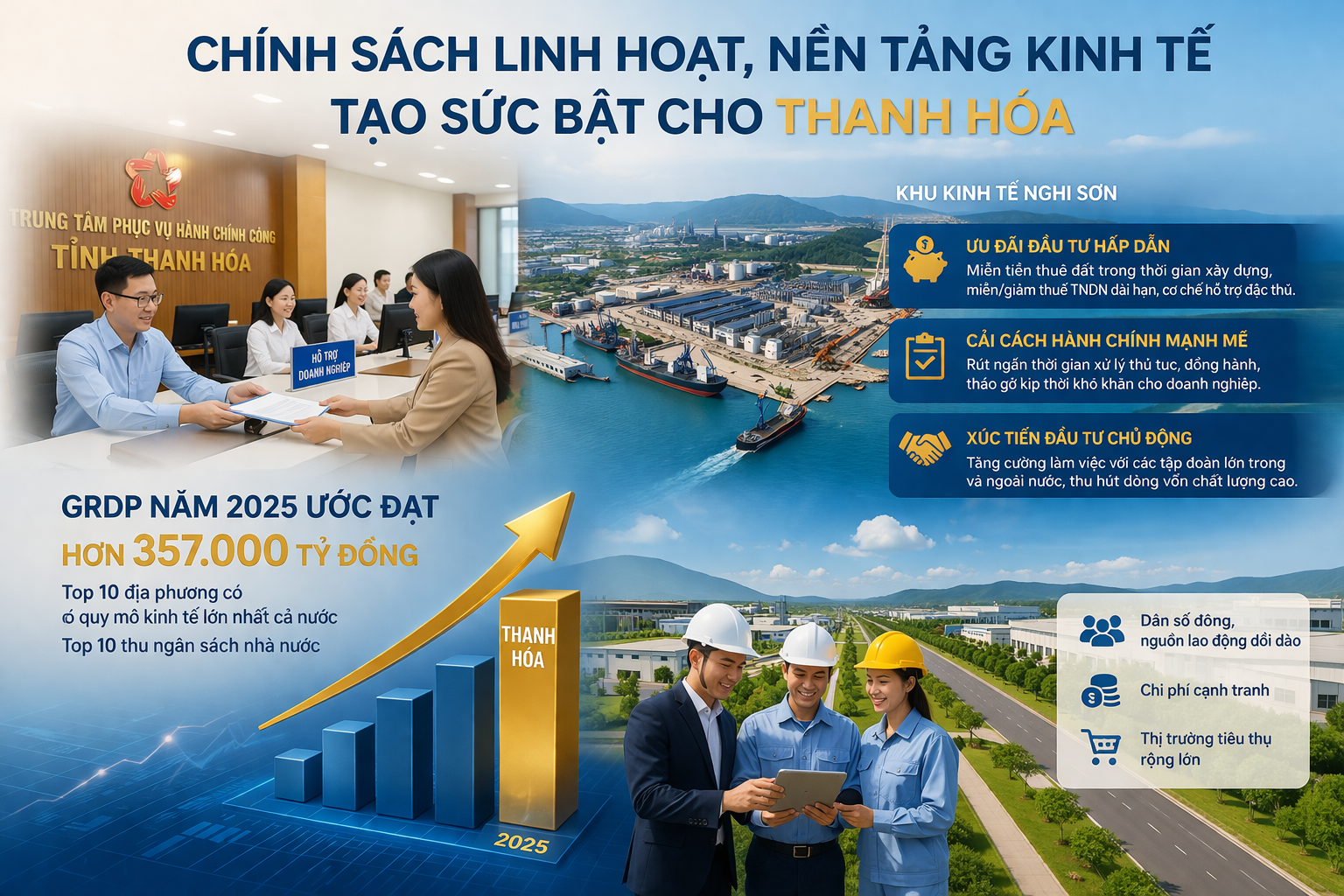 Một lợi thế quan trọng khác là quy mô kinh tế của Thanh Hóa ngày càng được nâng cao. Năm 2025, GRDP của tỉnh ước đạt hơn 357.000 tỷ đồng, nằm trong nhóm các địa phương có quy mô kinh tế lớn của cả nước, đồng thời thuộc Top 10 về thu ngân sách nhà nước.