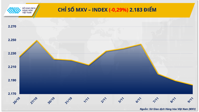 - Bước sang ngày thứ ba, chỉ số MXV-Index bị rơi điểm do sắc xanh yếu ớt của nhóm hàng nguyên liệu công nghiệp không đủ kéo chỉ số giảm của các nhóm hàng còn lại. Kết thúc phiên ngày 9/11, chỉ số này xuống 2.183,24 điểm, giảm 0,29%.