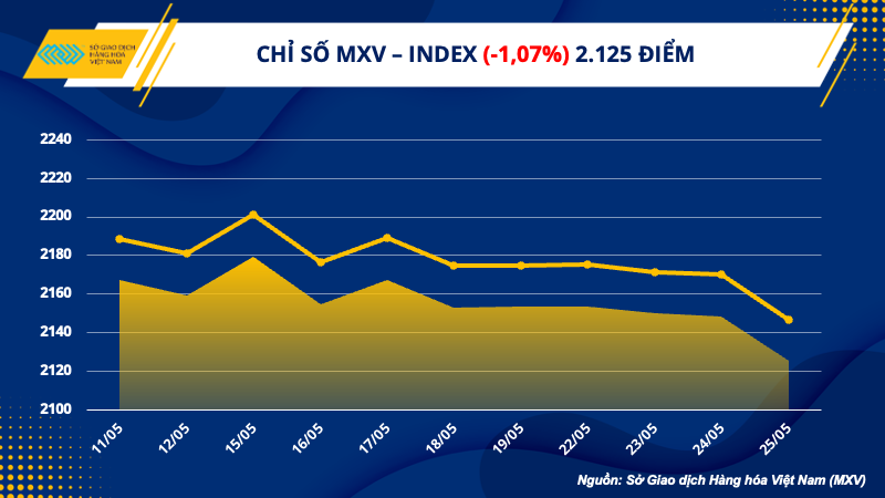 Dữ liệu từ Sở Giao dịch Hàng hóa Việt Nam (MXV) cho thấy, sau gần một tuần giao dịch diễn biến giằng co, đóng cửa hôm qua, lực bán được đẩy mạnh đã kéo chỉ số hàng hóa MXV- Index giảm 1,07%, đánh dấu phiên giảm thứ ba liên tiếp, xuống 2.125 điểm, thấp nhất trong vòng 2 tuần.