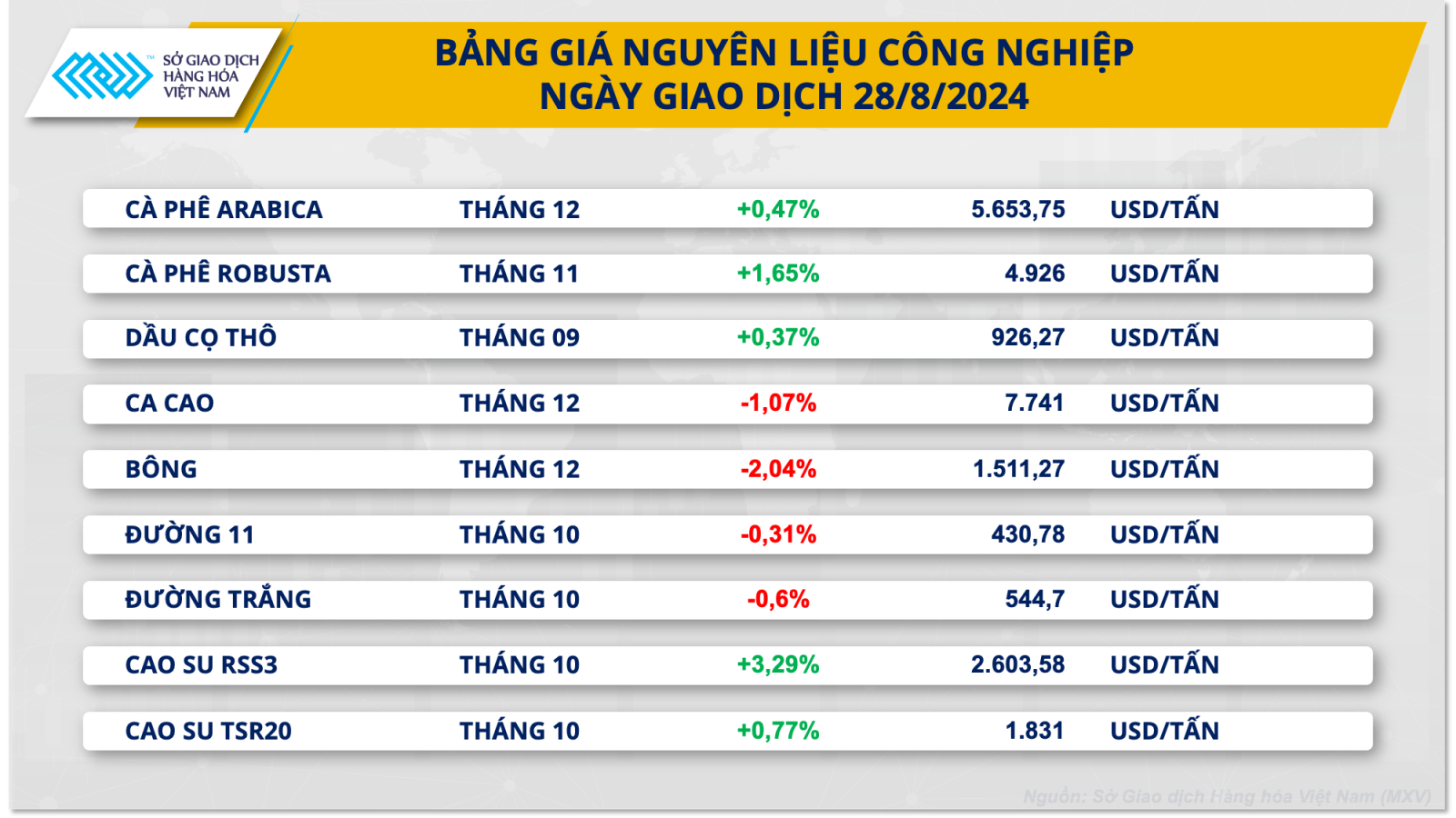 Sắc đỏ cũng xuất hiện trên bảng giá nguyên liệu công nghiệp ở mặt hàng đường thô, bông và ca cao. Đóng cửa, chỉ số MXV-Index giảm 1,04% xuống 2.136 điểm.