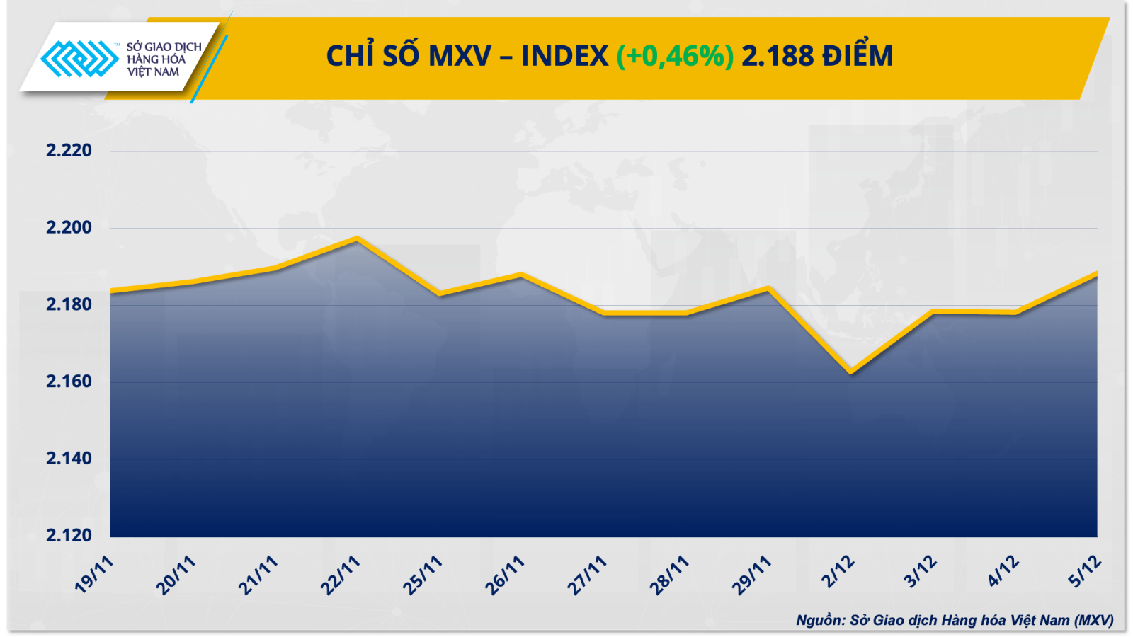 Theo Sở Giao dịch Hàng hóa Việt Nam (MXV), thị trường hàng hóa nguyên liệu thế giới diễn biến phân hóa trong phiên giao dịch ngày hôm qua (5/12). Tuy nhiên, lực mua chiếm ưu thế đã kéo chỉ số MXV-Index tăng 0,46% lên 2.188 điểm.