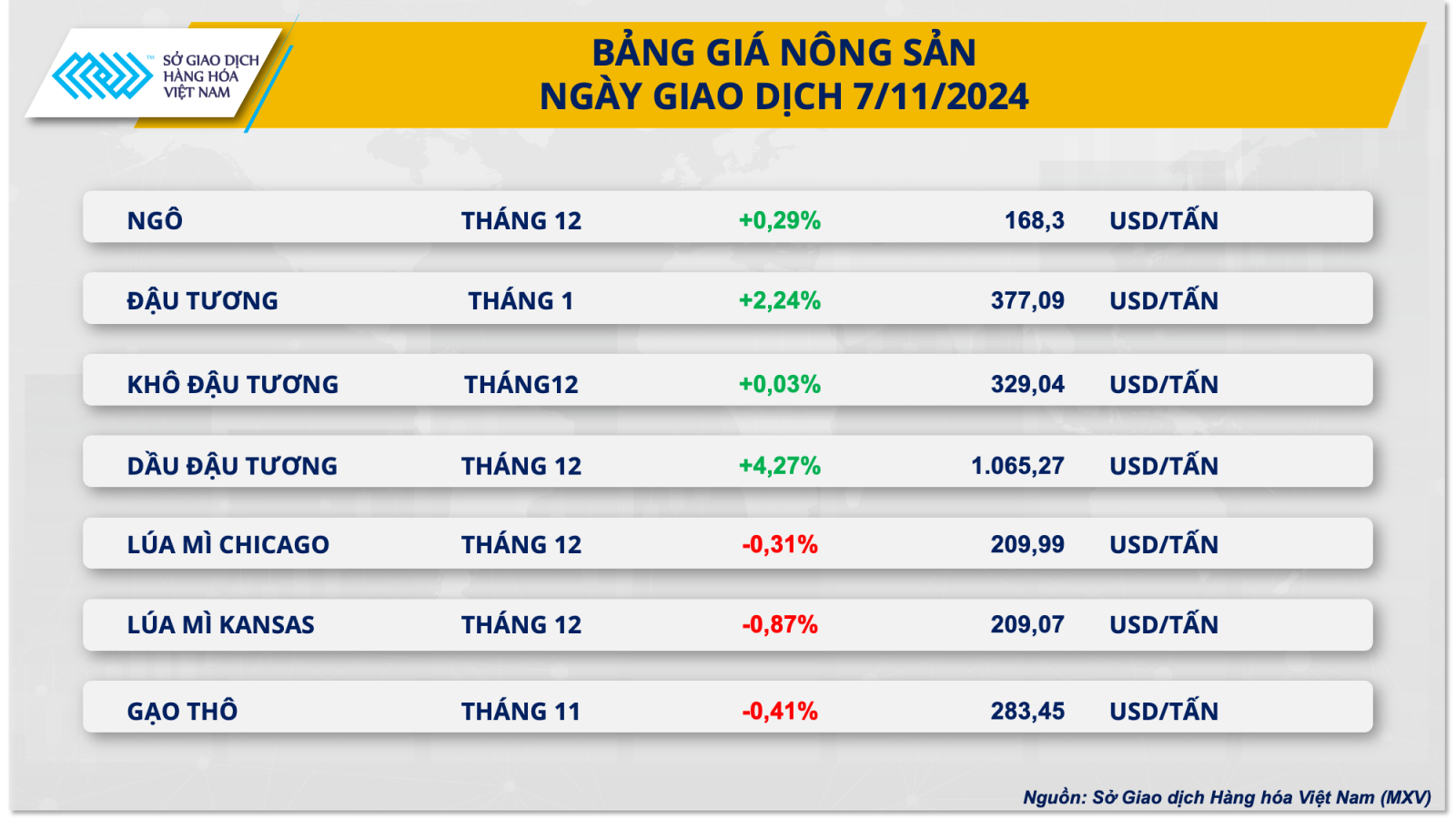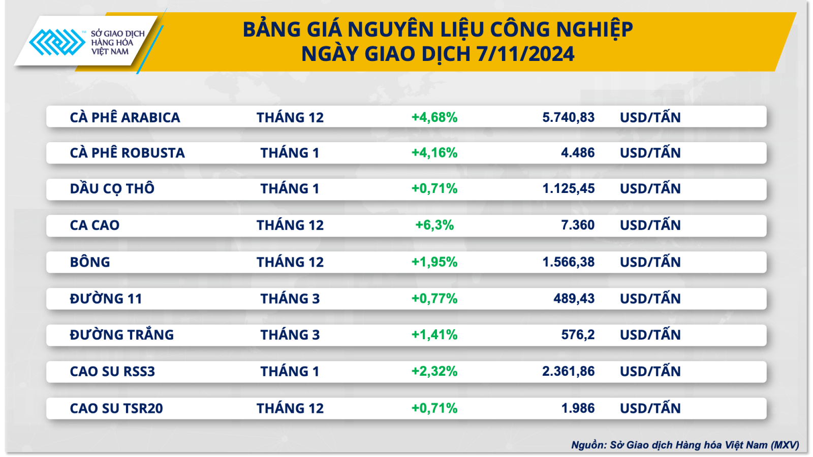 Sở Giao dịch Hàng hóa Việt Nam (MXV), cho biết sắc xanh bao phủ thị trường hàng hóa nguyên liệu trong ngày hôm qua (7/11) kéo chỉ số MXV-Index tăng 1,69% lên 2.208 điểm – mức cao nhất trong ba tuần trở lại đây. Đáng chú ý, toàn bộ 9 mặt hàng nhóm nguyên liệu công nghiệp đều đồng loạt tăng giá, trong đó dẫn đầu là ca cao bứt phá 6,3%, c&agrav