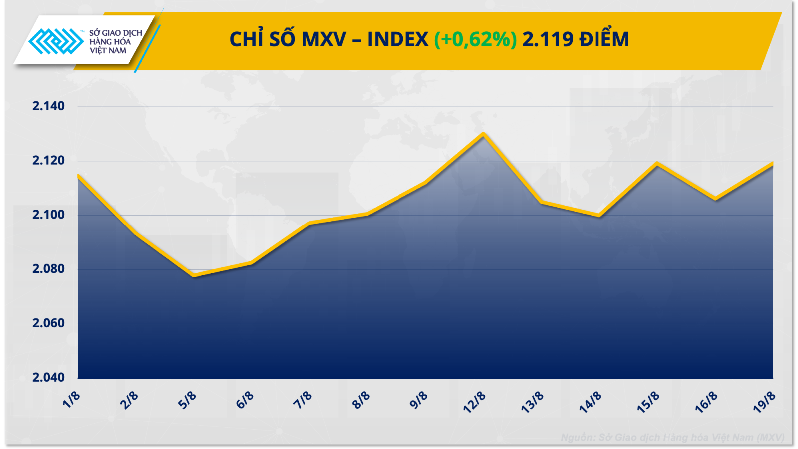 Theo Sở Giao dịch Hàng hóa Việt Nam (MXV), sắc xanh đã lan rộng trên thị trường hàng hóa nguyên liệu thế giới phiên giao dịch đầu tuần (19/8). Lực mua áp đảo đã kéo chỉ số MXV-Index tăng 0,62% lên 2.119 điểm.